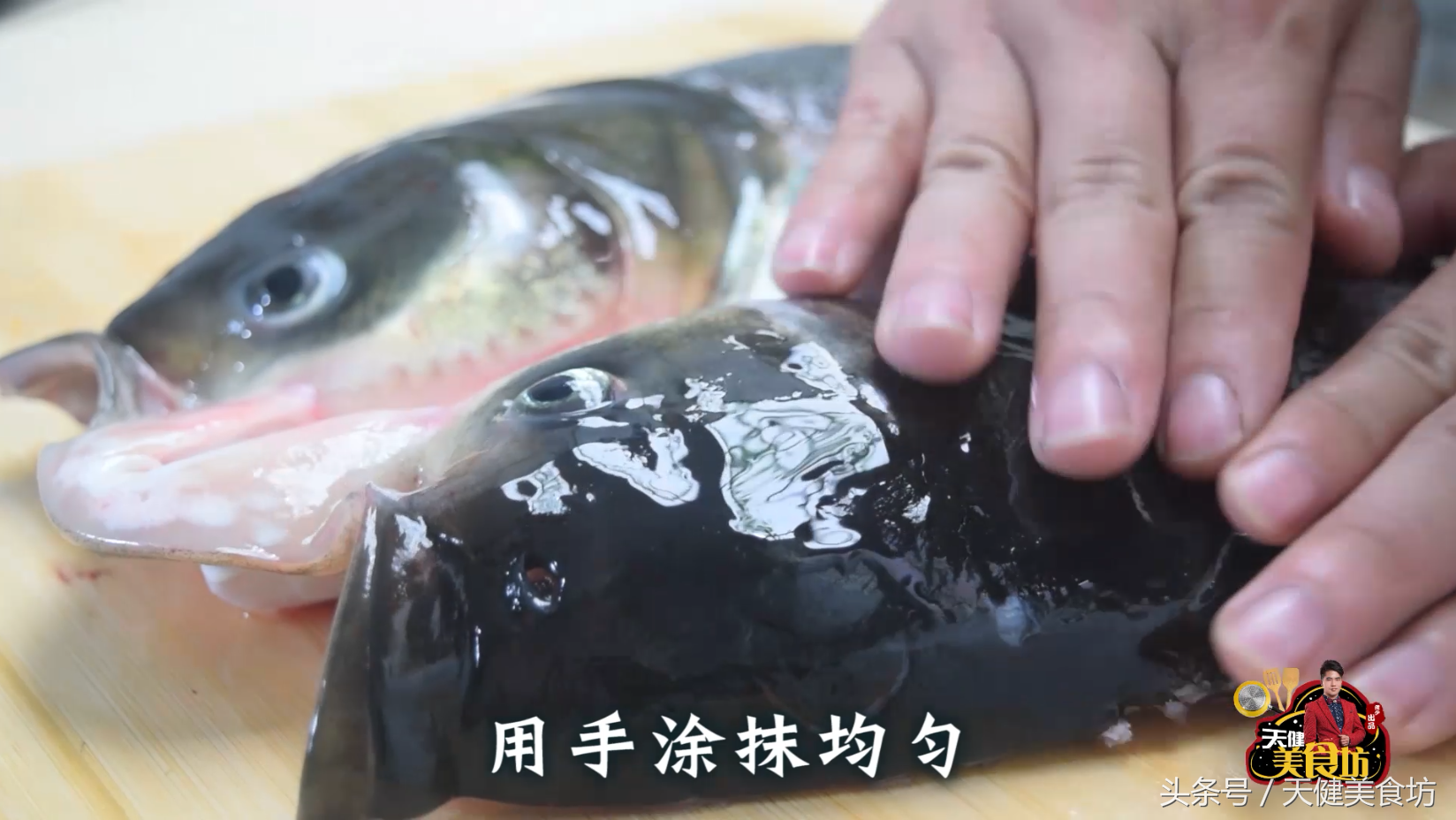 食材准备好之后,我们处理鱼头,买回来的鱼头清洗干净,看看鱼鳃和鱼肠肚有没有弄干净,没有的话顺手弄干净。鱼头处理干净之后,淋上适量的料酒,然后用手轻轻的抹匀,加料酒可以很好的去除鱼头上面的腥味。接着再撒上一层薄薄的食盐,用手抹匀,这样可以给鱼头腌入一些底味,到时候蒸出来的鱼头才够味,吃鱼有一种叫法叫做【咸鱼淡肉】,意思就是鱼要做的好吃就要稍微的偏咸!抹匀食盐之后,我们把鱼头放一边,腌制10分钟,备用!