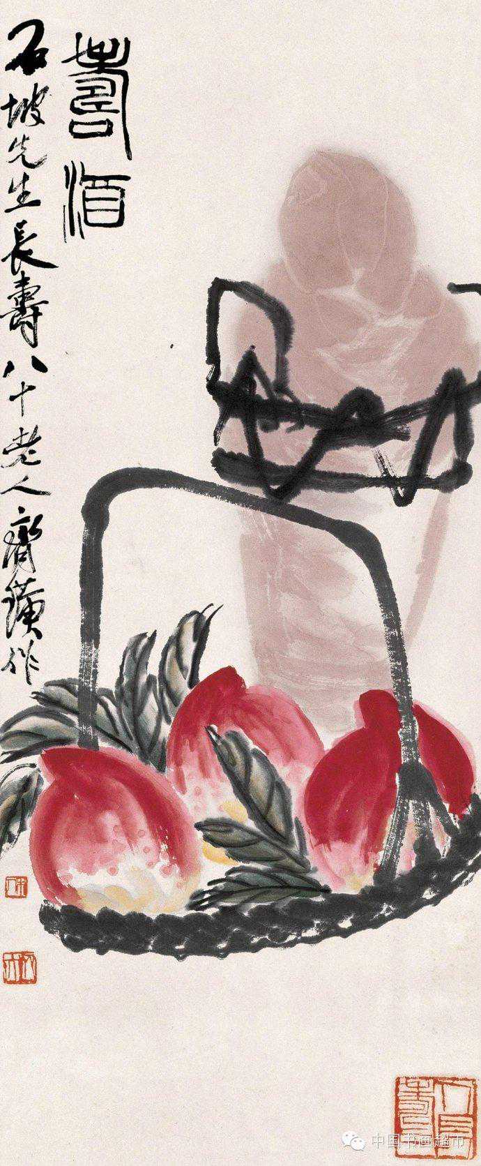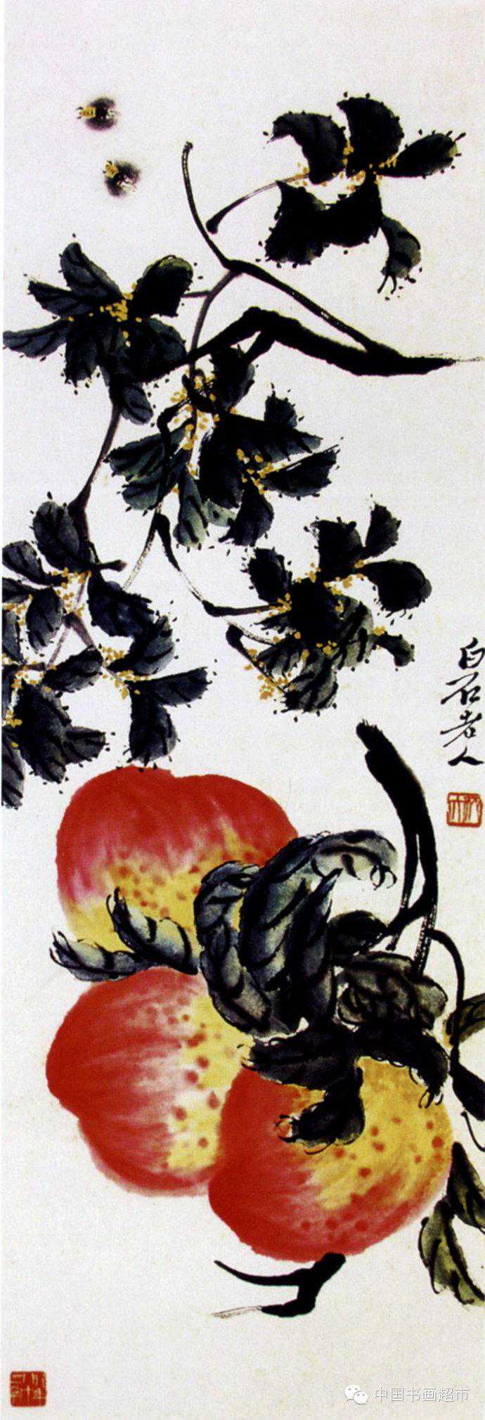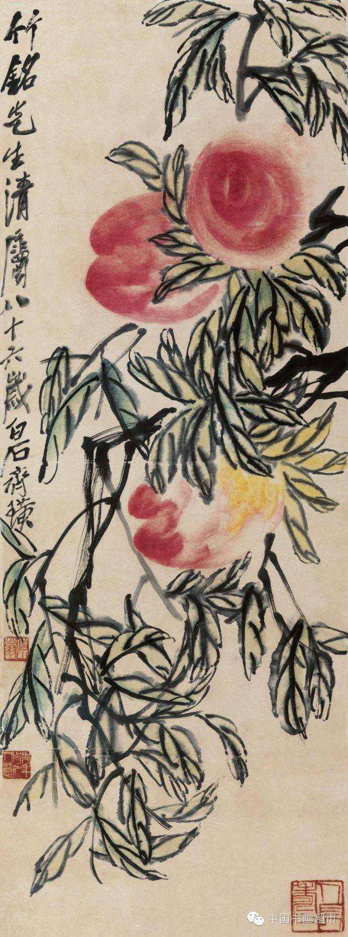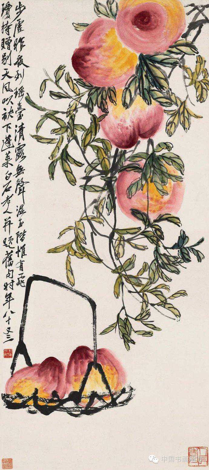 齐白石衰年变法,多取法老缶吴昌硕;但这取法又不是简单的模仿,而是笔墨精神。他自己说:“我是学习人家,不是摹仿人家,学的是笔墨精神,不管外形像不像。”其中尤以画桃极为神似。齐白石画桃,先以没骨大写意法直接用洋红泼写硕大桃实,渗以少许柠檬黄,再以花青、赭墨写出叶子和枝干,后用浓墨勾勒叶筋,设色浓重艳丽。与其画荷花所创的红花墨叶恰成强烈对照。不仅桃实的分布颇具匠心,极臻疏与密、藏与露之妙,即寿桃的向背光都以颜色的变化来确切地表现出来。