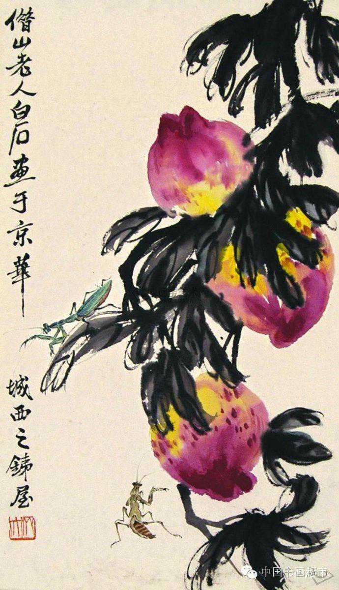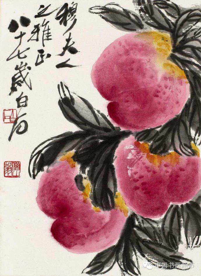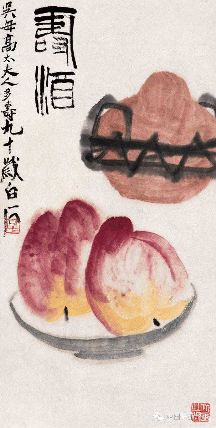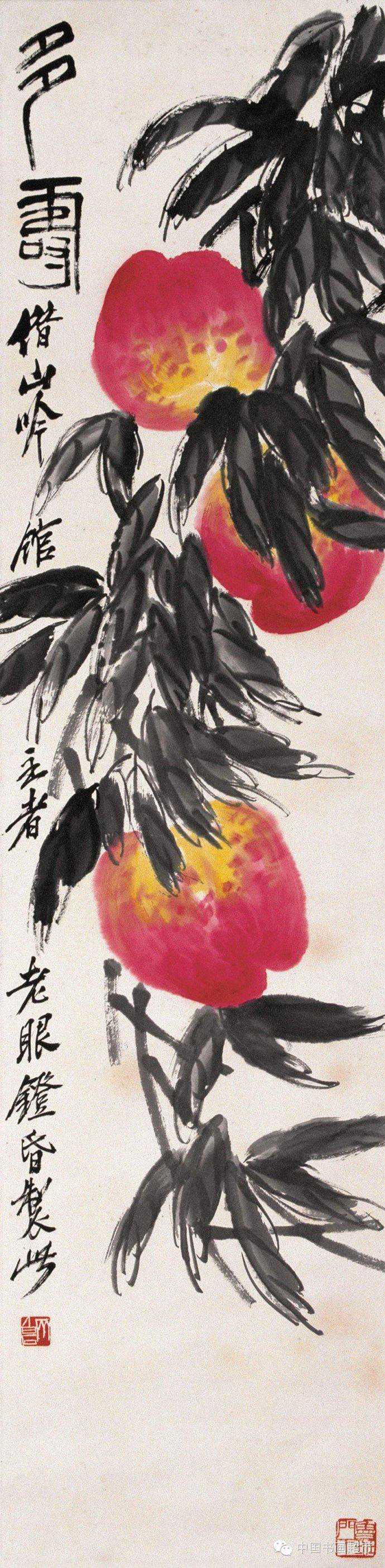 齐白石衰年变法,多取法老缶吴昌硕;但这取法又不是简单的模仿,而是笔墨精神。他自己说:“我是学习人家,不是摹仿人家,学的是笔墨精神,不管外形像不像。”其中尤以画桃极为神似。齐白石画桃,先以没骨大写意法直接用洋红泼写硕大桃实,渗以少许柠檬黄,再以花青、赭墨写出叶子和枝干,后用浓墨勾勒叶筋,设色浓重艳丽。与其画荷花所创的红花墨叶恰成强烈对照。不仅桃实的分布颇具匠心,极臻疏与密、藏与露之妙,即寿桃的向背光都以颜色的变化来确切地表现出来。