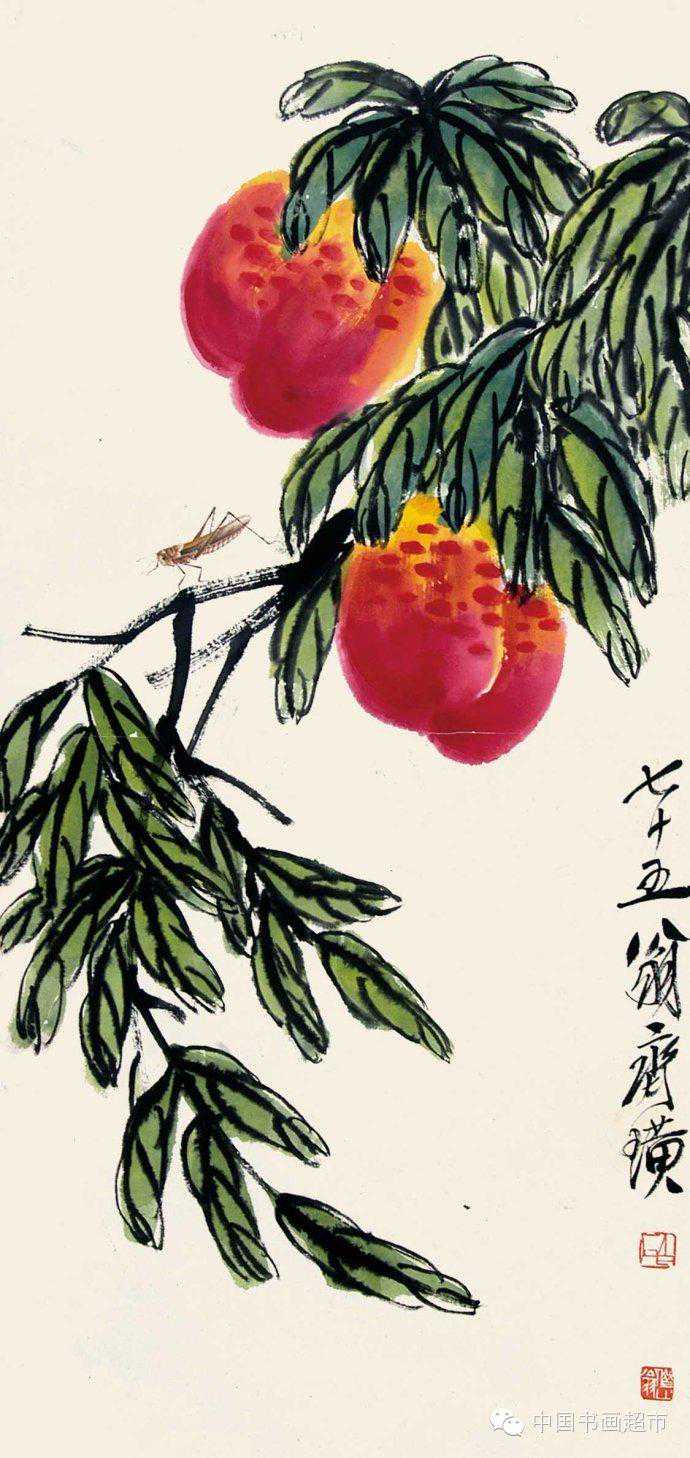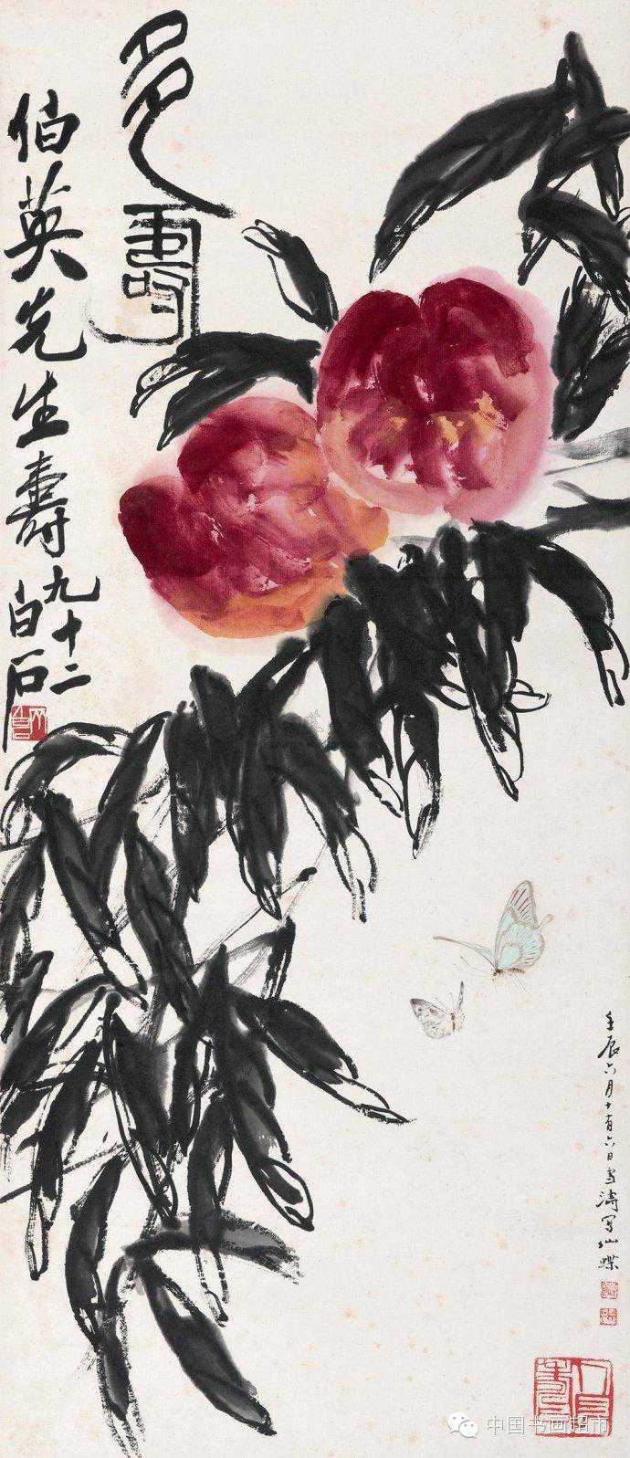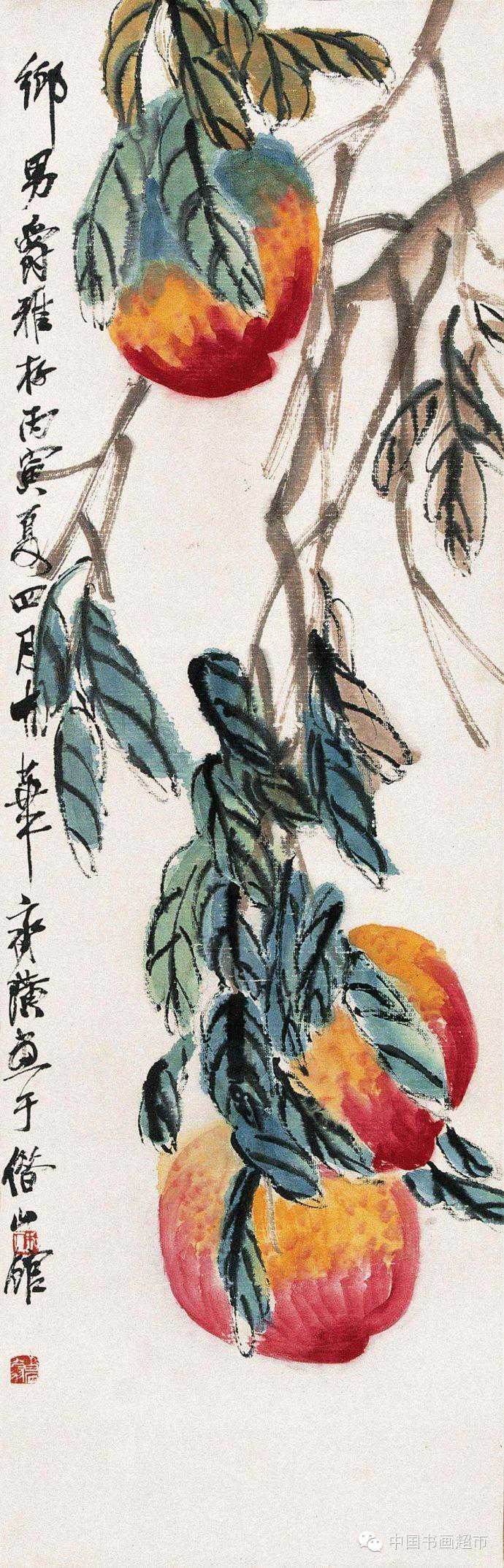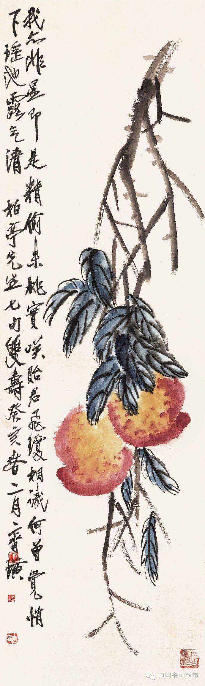 齐白石衰年变法,多取法老缶吴昌硕;但这取法又不是简单的模仿,而是笔墨精神。他自己说:“我是学习人家,不是摹仿人家,学的是笔墨精神,不管外形像不像。”其中尤以画桃极为神似。齐白石画桃,先以没骨大写意法直接用洋红泼写硕大桃实,渗以少许柠檬黄,再以花青、赭墨写出叶子和枝干,后用浓墨勾勒叶筋,设色浓重艳丽。与其画荷花所创的红花墨叶恰成强烈对照。不仅桃实的分布颇具匠心,极臻疏与密、藏与露之妙,即寿桃的向背光都以颜色的变化来确切地表现出来。