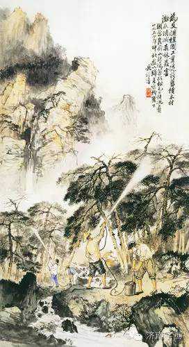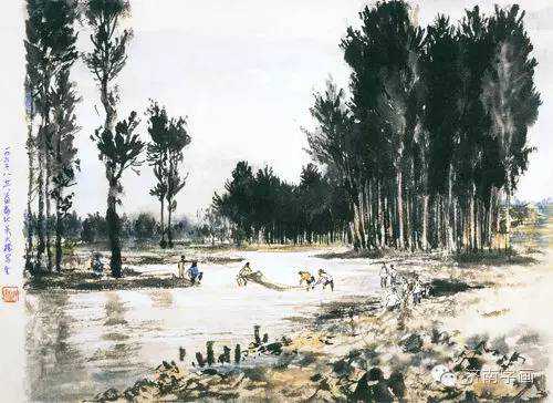 更难能可贵的是,他善于融通各家各派,广泛吸收各方面营养。作为一名富有天赋的艺术家,各种技法在他胸中经过自我点化,熔冶于一炉,在随手挥洒间,笔笔都是出自机杼。看他的水彩作品,安静,透明,用笔率性、轻松,色彩柔和,色调统一,树梢的线条灵活又稳健,看得出他的笔墨修养,但丝毫没有中国画中树法程式化的痕迹。同样,他在写意山水画中,不满足于简单的赭石、花青的渲染,而是巧妙地吸收了西画色彩的因素,使画面变得更为丰富。但是他的用线用墨又非常讲究,用纯粹的笔墨功夫表达了山水的意境。创作于1956年的《湖滨晴晓鸭捕蝻》,以写实手法表现微山湖畔鸭群捕虫的生动画面,嬉戏的鸭子姿态各异,角度多样,体现了画家敏锐的观察力和很强的结构写生能力。他在重视捕捉形的同时,运用笔墨的抑扬顿挫、轻重缓急,使笔下鸭子的神情、动态跃然纸上。当时的中国画坛,不少人在试图走中西结合的路子,但是成功的并不多,往往会出现这样一种情况:东方传统的元素拿到西方绘画里面,或者西方的元素放在东方传统绘画里面,二者不能融合,格格不入,不伦不类。而岳祥书先生却做到了东西方文化的有机结合,把写实技法熟练地运用在中国画的探索与发展的道路上,他走在了前面。