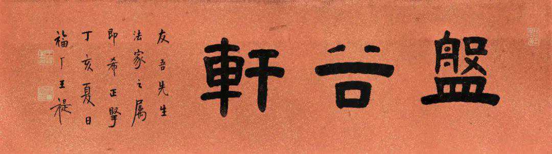 沙孟海的书法,有浓墨重写的观感,同时亦可见飞白。事实上,浓墨写书,稍有不慎极易臃肿,线条如浸水木椽,骨力难有。而孟翁中锋立骨,侧锋取妍,使得其字大气磅礴,刚强有力,可见其书艺之精熟。是作作于1988年,上款“斗盦”即日本书法家小林斗盦,斋号“怀玉印室”。1988年刘江访问日本时,曾转交沙孟海所书“怀玉印室”横幅。
