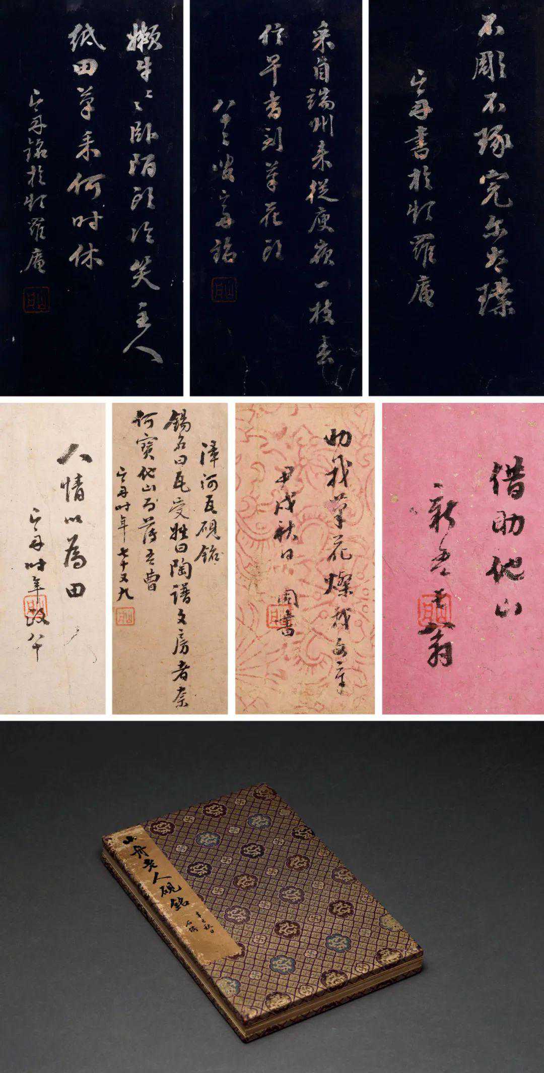 此册乃集晚清民国诸名家所作书画题拓而成,主体为吴大澂手书金文集联六对,罗振玉亲书释文一页,并有吴氏绘于十六金符斋印谱页上山水一帧。其余为吴大澂所集金文拓片及郑文焯所题拓片印蜕数种。册前有吴隐手札一封,其中提到与吴昌硕赏雪之会。虽小小一册,实收纳多位晚清名家手迹,内容丰富,殊可把玩。