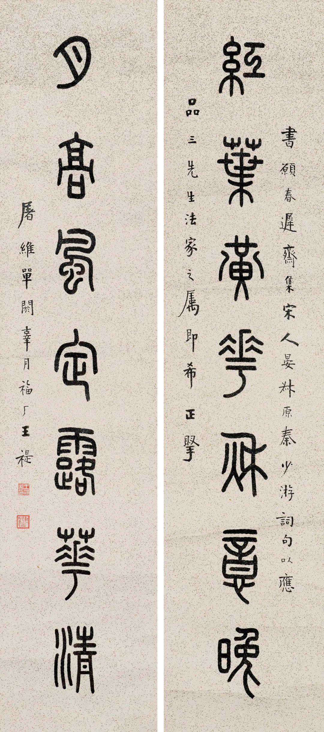 丁辅之是晚清著名藏书家“八千卷楼主人”丁松生从孙。其亦是西泠印社创始人之一,喜篆刻,殆有收罗,尤以西泠八家印作为多。此扇丁辅之写红梅、金文。其中红梅点点,枝干粗虬,墨色的晕染,亦是得宜,画面清雅脱俗。而金文则瘦而劲挺,齐整工丽。
