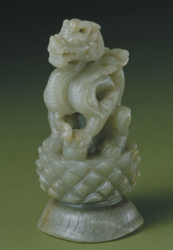 圆雕坐龙居于莲花座之上。龙昂首,一爪抓握火焰珠。双角,眉目细长,向后延伸。背起脊,关节处阴刻后扬之肘毛,将龙、莲花组合,体现了佛教对玉雕工艺的影响。