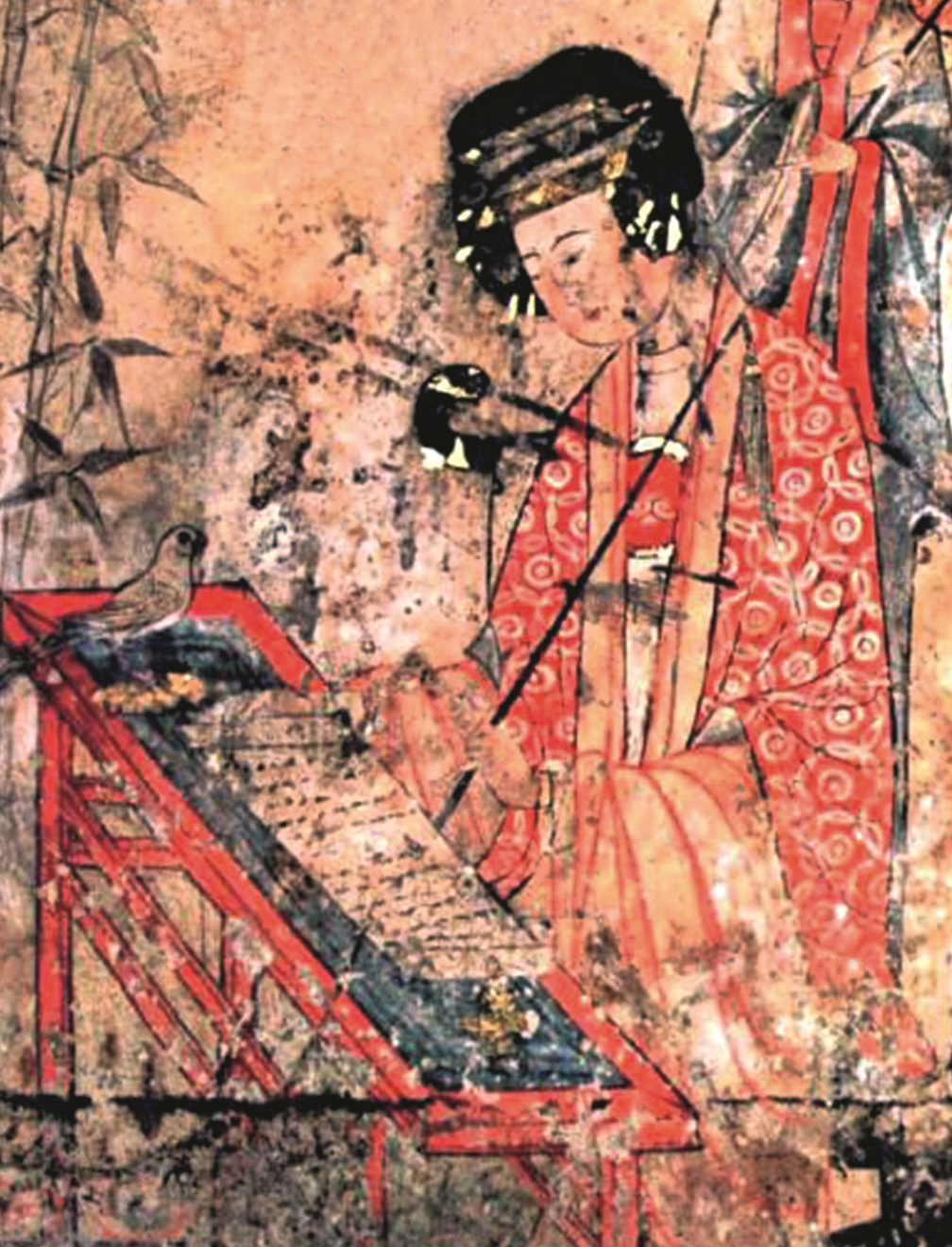 唐代开中国绘画史之新纪元,生活画逐渐走出墓葬,成为屏风画、卷轴画等专供欣赏的艺术作品。唐代中期,仕女画、山水画以及花鸟画逐渐兴起,美人与花鸟组合传统亦肇始于此。唐墓壁画及雕刻即可观其大略,传世绘画则更加直观呈现了美人调鹦鹉的画面风格。