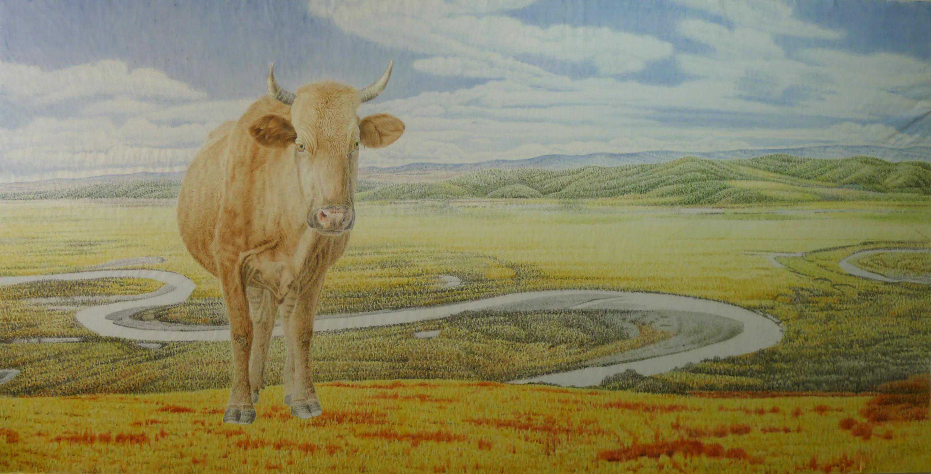 绕了这么一个圈,只是想说明,常老师绘画中的牛的神韵,是非常高妙的。作为大幅的中国工笔画,作品本身就是时间,热情,技艺与专注的集合体之杰作,画幅中众多的牛的同与异,无数细节,整体布局,色彩的烘托,真的具备了大巧之境。大多数人,均可以从这样工笔细致与宏大述事之中,享受到美感。但最难的是其蕴涵的神韵,既具大巧之飘逸细腻,又合若拙式旷达厚重!格局神韵极高。常老师的画,让人心驰神往,于我而言,好像悠然间重返非洲大草原,旁观动物大迁涉,又似置身于南极最后的极地净土,在无数企鹅间穿行。山水之间,自然之地,动物万类,感受大爱无疆。