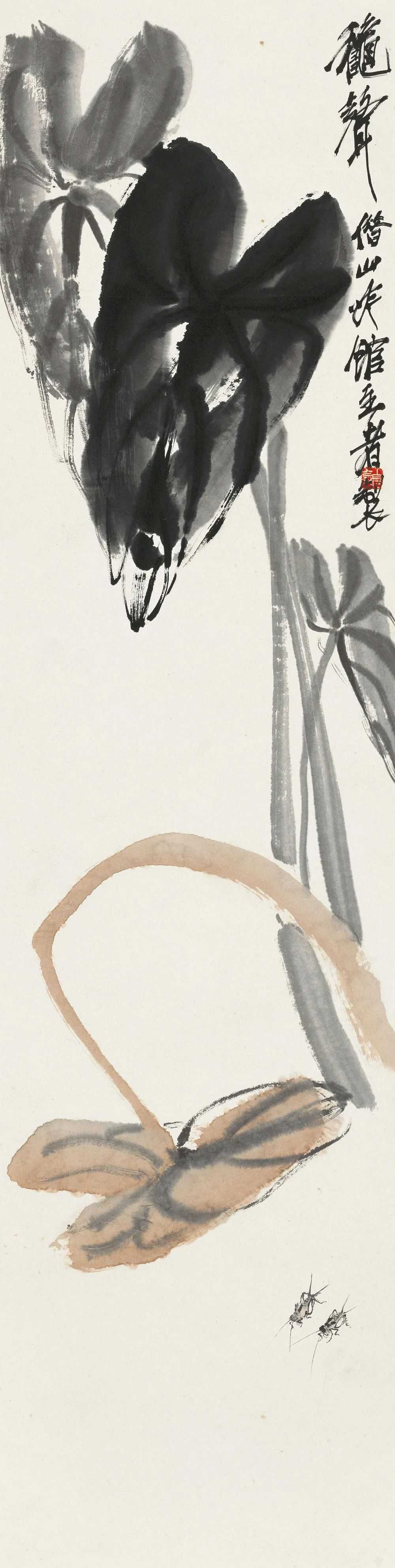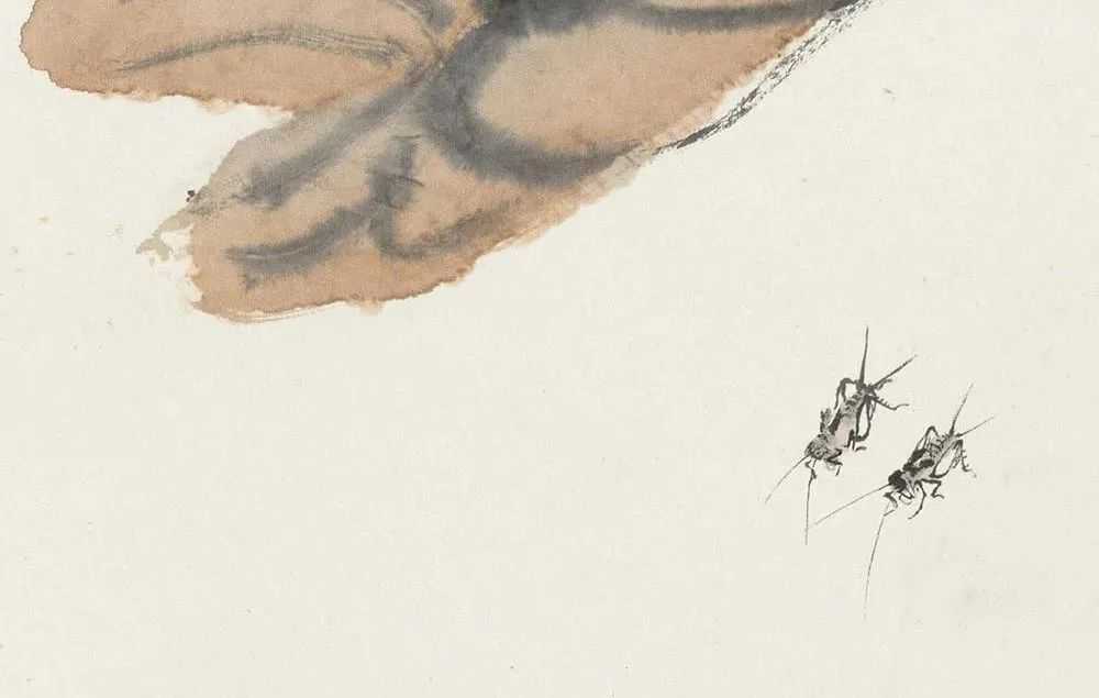 这幅《秋声》画芋叶蟋蟀,四片芋叶中,纯用水墨的三片肥厚葱郁,尚能挺立如初,用赭石绘成的那片茎已低垂,秋天已至,弯曲的动势也将观者的视线引向叶下的一对蟋蟀。它们似乎也感知到季节的变换,雄虫奋力鸣叫,老人在画幅右上方题写画名《秋声》,使观者从这幅静止的作品中似乎也能听到蟋蟀的欢唱,仿佛在极尽宣扬秋日的强悍生命力。