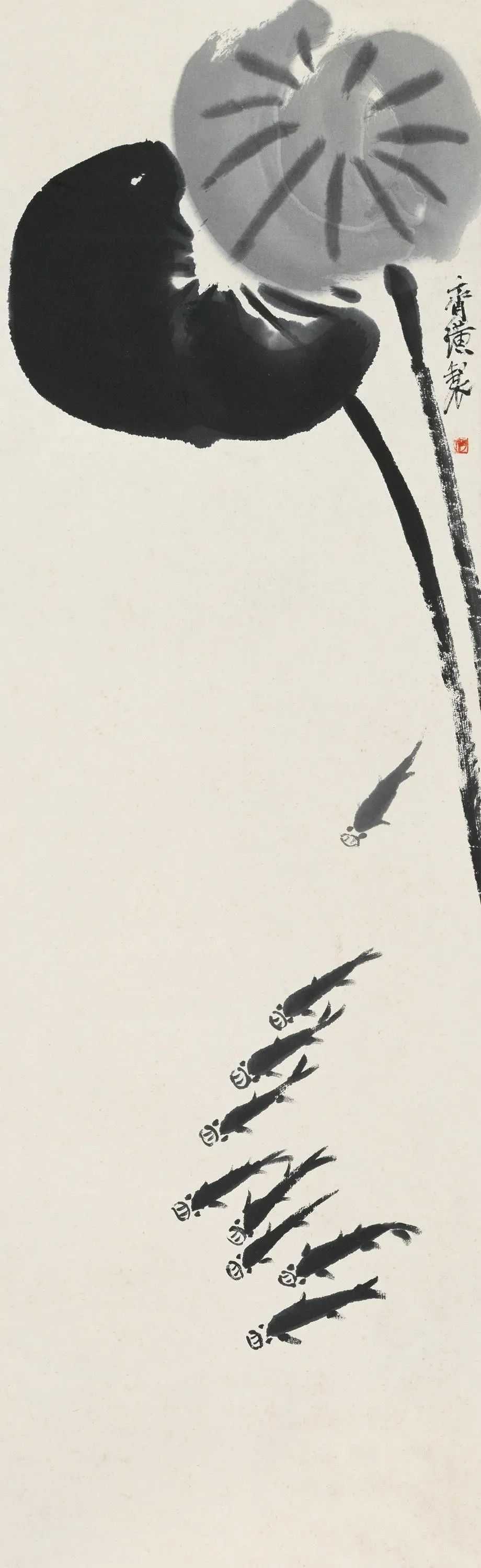 齐白石《莲叶小鱼》