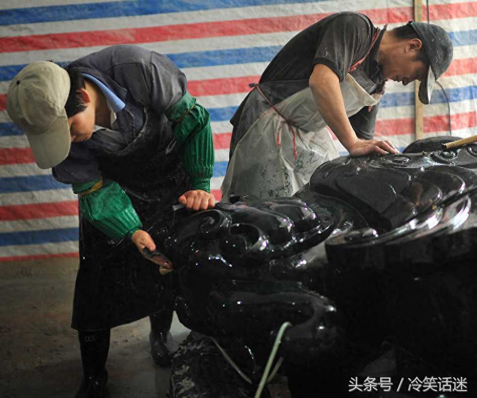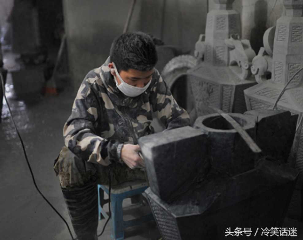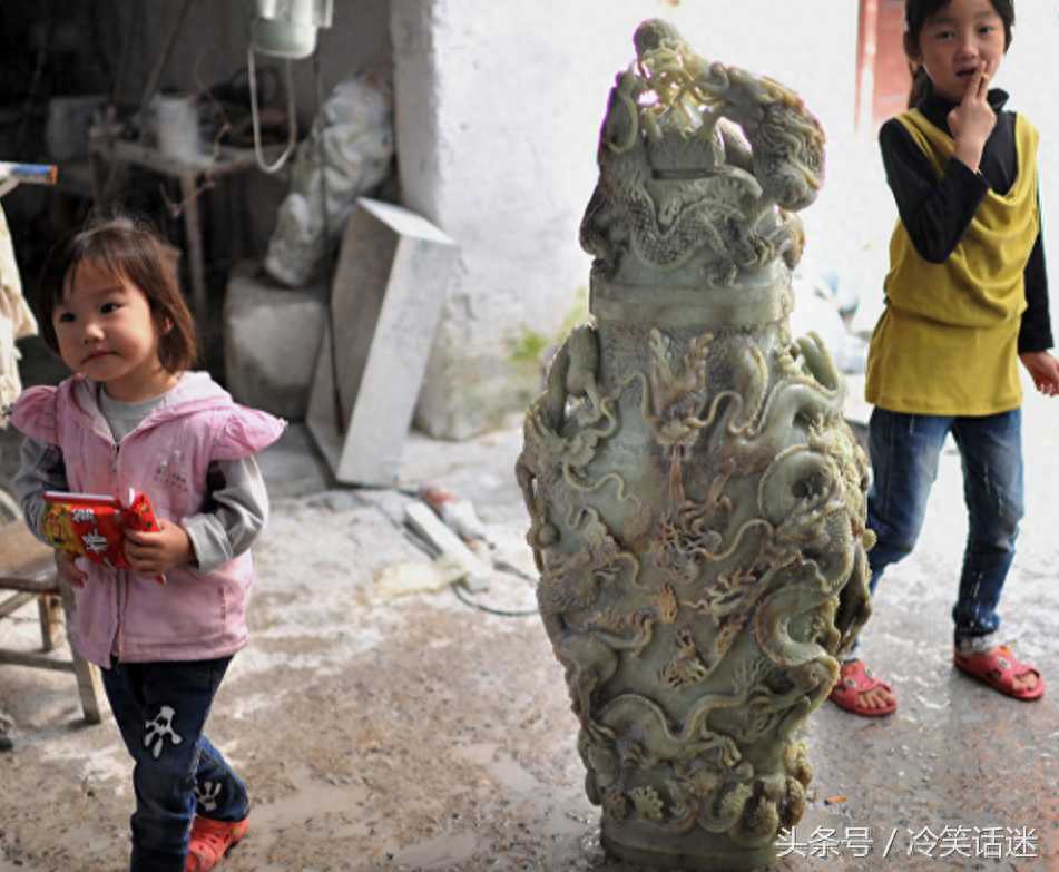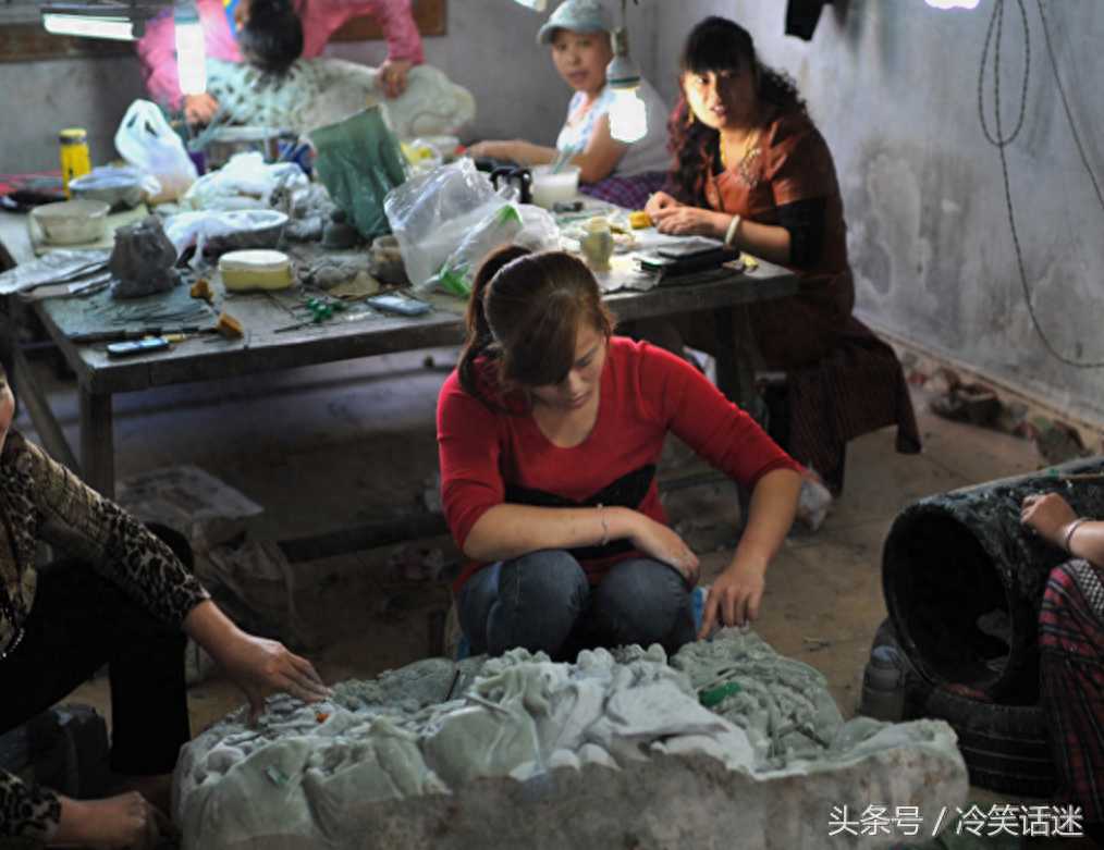 两工人正在打磨玉麒麟,而这样的巨型玉器市面上得卖个百万