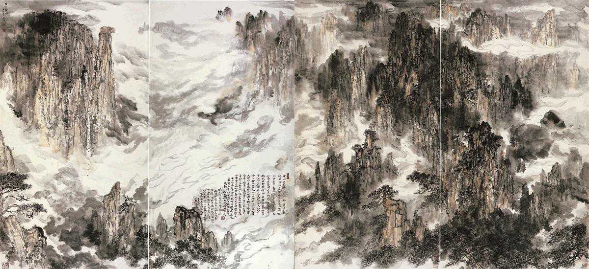 吴静山善于以墨之浓淡干湿营造出高远山水的苍茫、雄浑之意境,近观得山石之纹理,远观得山势之磅礴。在视角撷取上,其从多角度入手,有仰视,有平视,亦有俯视,让观者如身临其境,在山底,在山腰,在山顶间窥见不一样的山水风情。