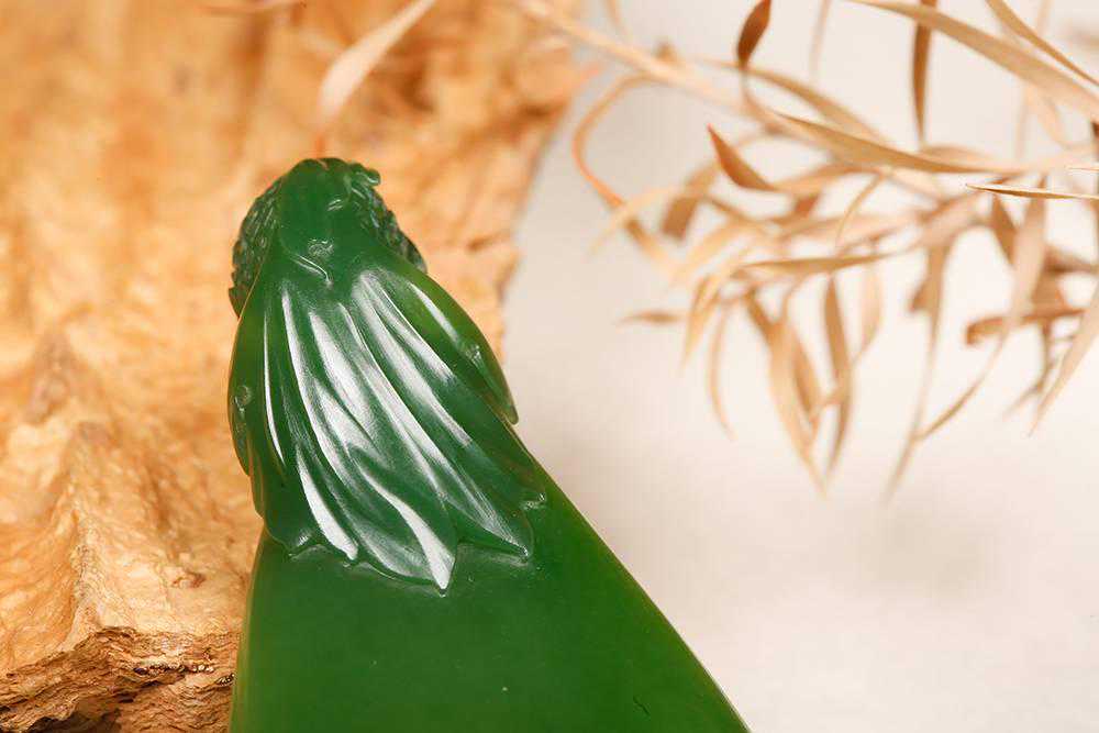 水色香溢,俄罗斯碧玉,肉质非常细腻,可过灯,润度很好,油分十足,扬州名家精工,尺寸约80.5*33.7*16.8mm,重约23.9克。