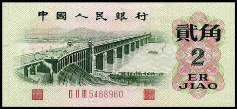 第三套人民币贰角,1962年制版,1964年4月15日发行,正面左侧为武汉长江大桥图,主色为墨绿色,第三套人民币2角二罗背面为牡丹花、国徽蒙、藏、维、壮文行名和面值,主色为浅绿色。