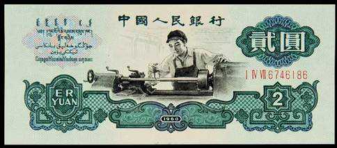 第三套人民币贰元1964年4月15日发行,1991年3月1日只收不付,2000年7月1日停止流通。正面图景是车床工人,正面颜色为深绿色,反面为浅绿色,非常漂亮大气,是众多收藏爱好者评为最经典的钱币。这张绿色的两元券,因存世量不多,是第三套人民币的领头羊,也是整个钱币市场的风向标。