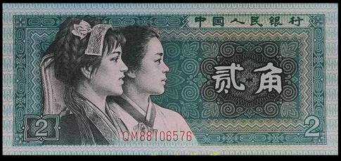 第四套人民币贰角券行内称8002,80版贰角券是第四套人民币的辅币,1988年5月10日公告发行。80版贰角券正面主图为布依族、朝鲜族人像,背面主图为国徽,正背面主颜色为蓝黑色,非常美观。目前四版币已经退市,此券被众多钱币投资者看好。