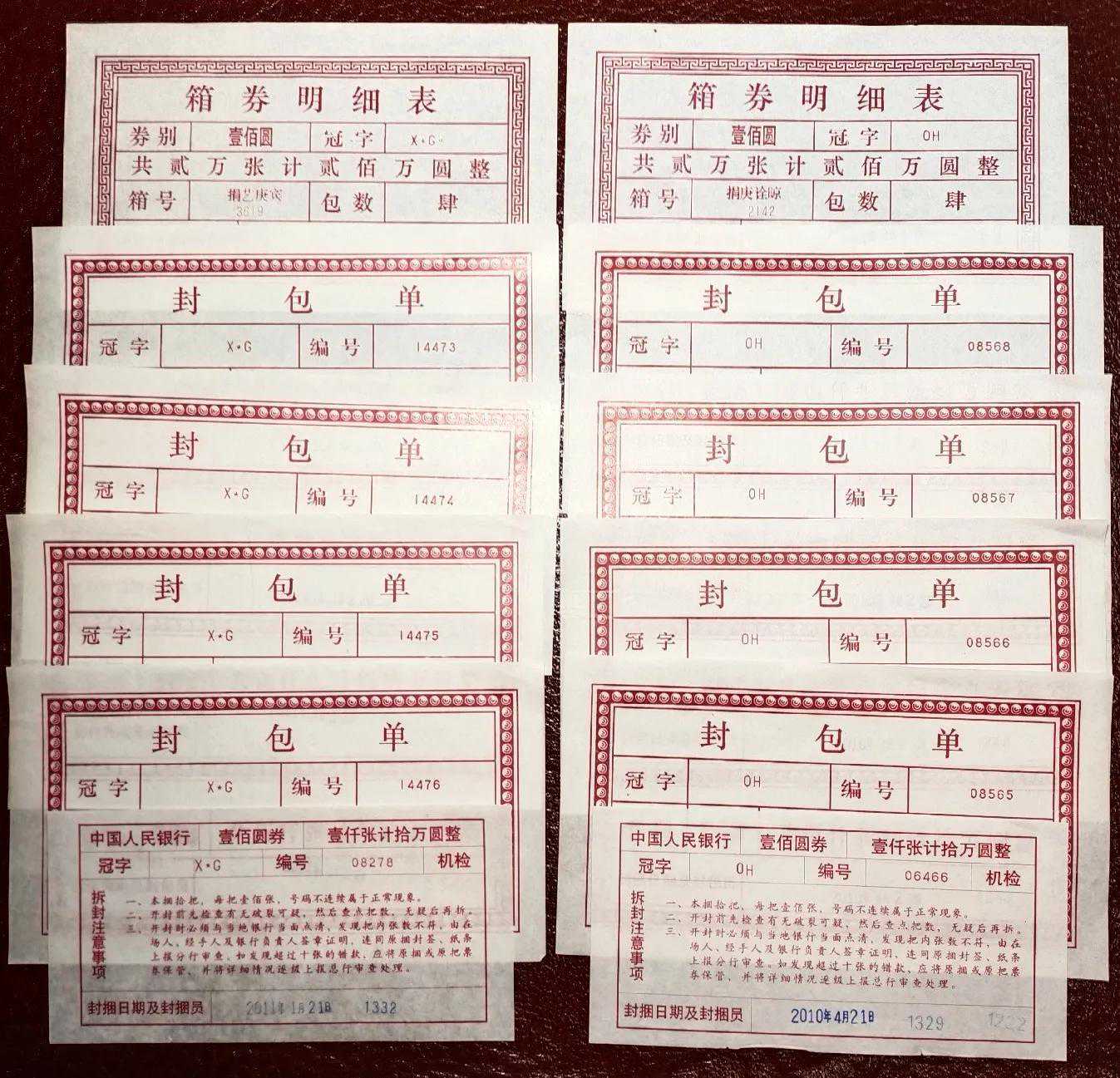 纸币封签分为包单、箱签和捆签等,上面记录有纸币的冠字号码、封捆日期、封捆员姓名等信息。五万张纸币为一包,有一张包单,一万张纸币为一箱,有一张箱签,一千张纸币为一梱,有一张捆签。