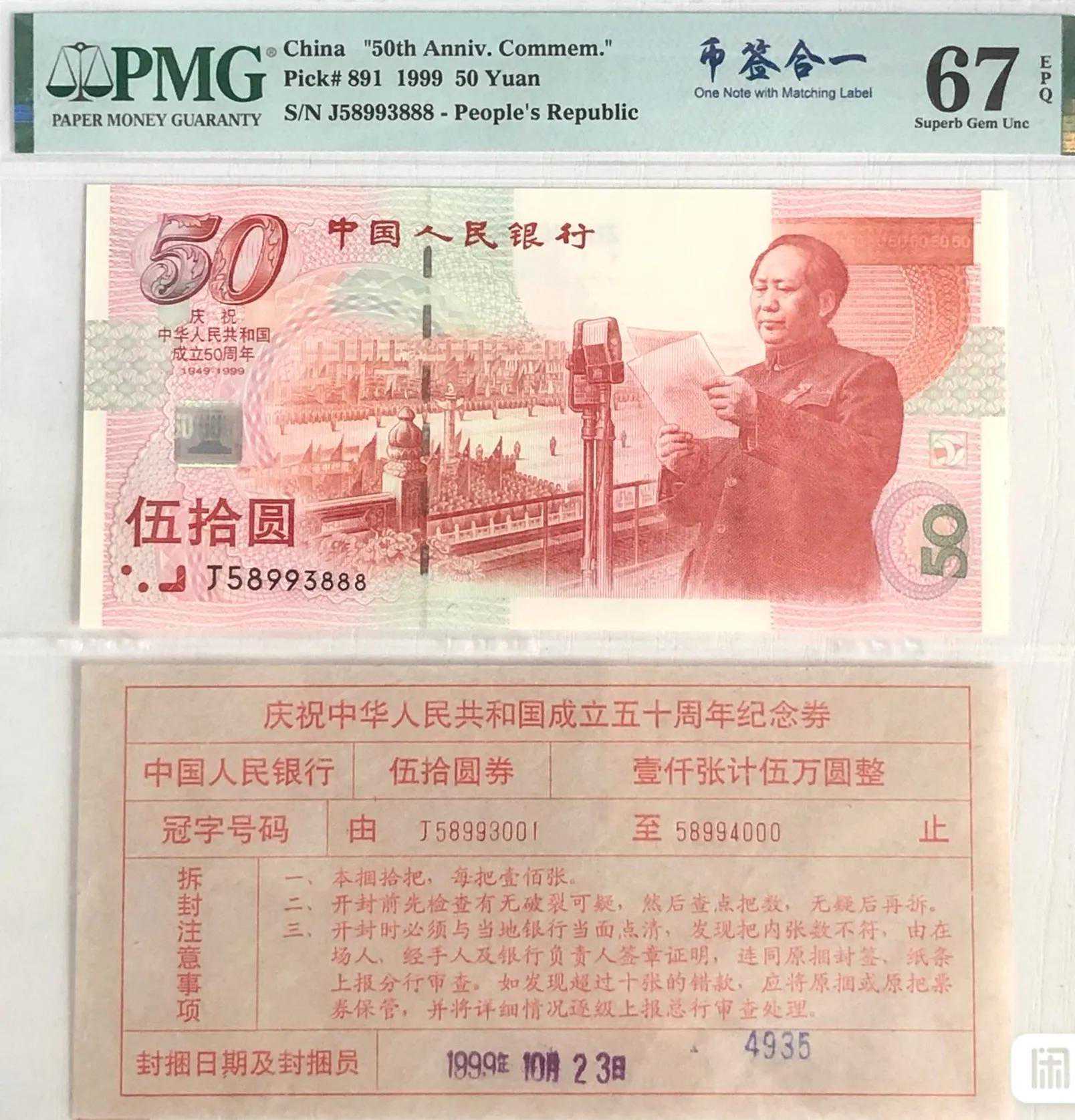 现在这张纸签可以和纸签上冠号号码内的纸钞一起评级封装入壳,称为币签合一,价格比单张纸币溢价不少。普通的封签涨到百十元,币签合一中的纸币价值越高,封签的价值也越高,有些达上千元甚至几千元。