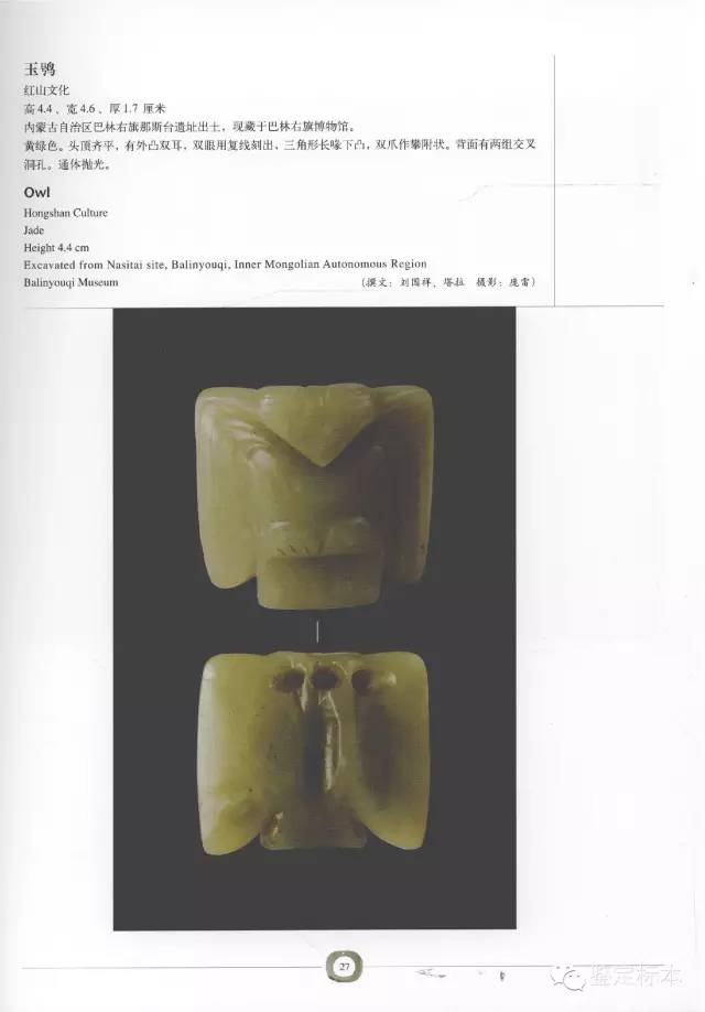 無耳為鷹,是太陽的象征,凸眼,折肩,雙爪在腹部,背部有兩個隧孔,典型紅山文化特征。