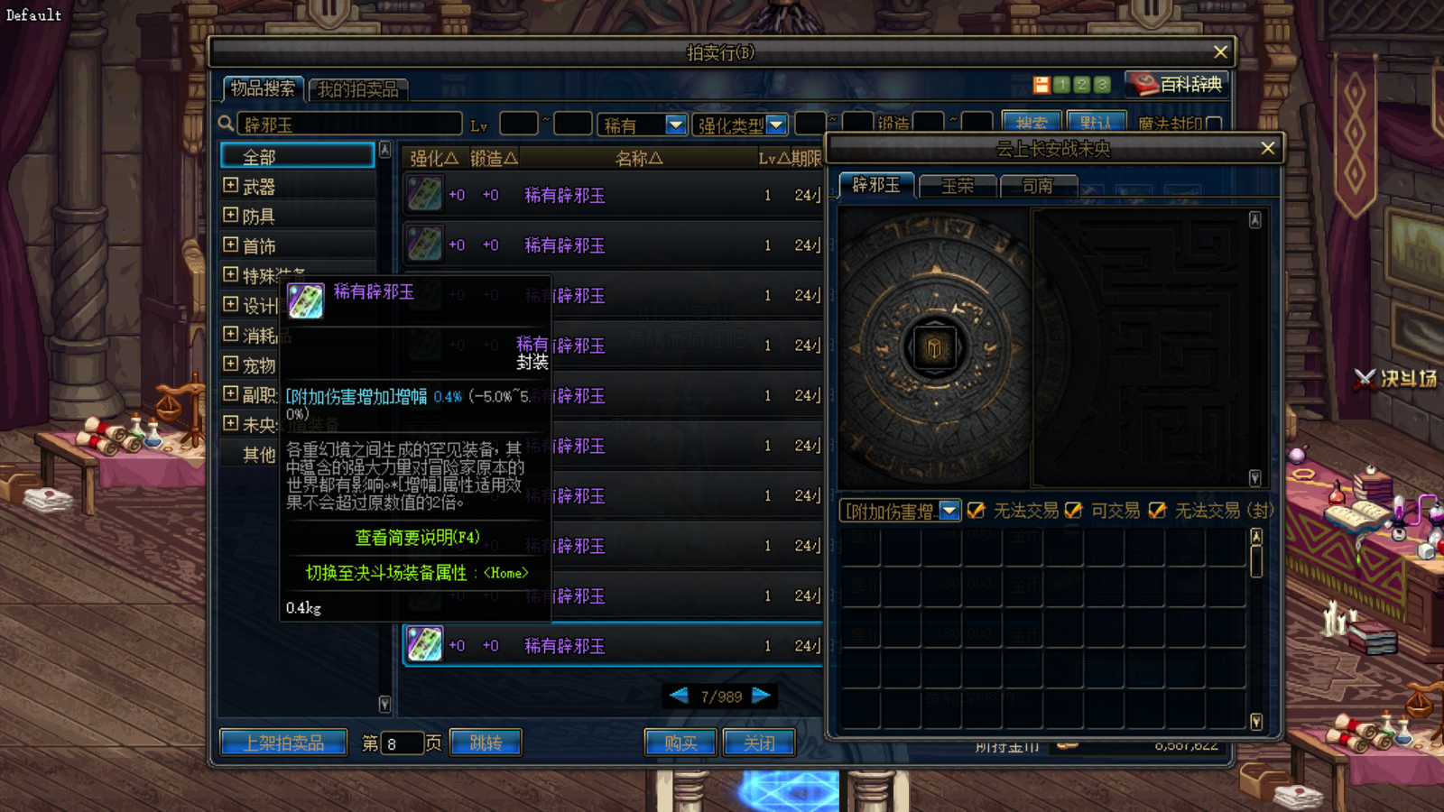 第三步:拍卖行输入辟邪玉并搜索,此时可以看到辟邪玉都是暗的,然后翻页看到亮起来的辟邪玉就是你想要的属性了。
