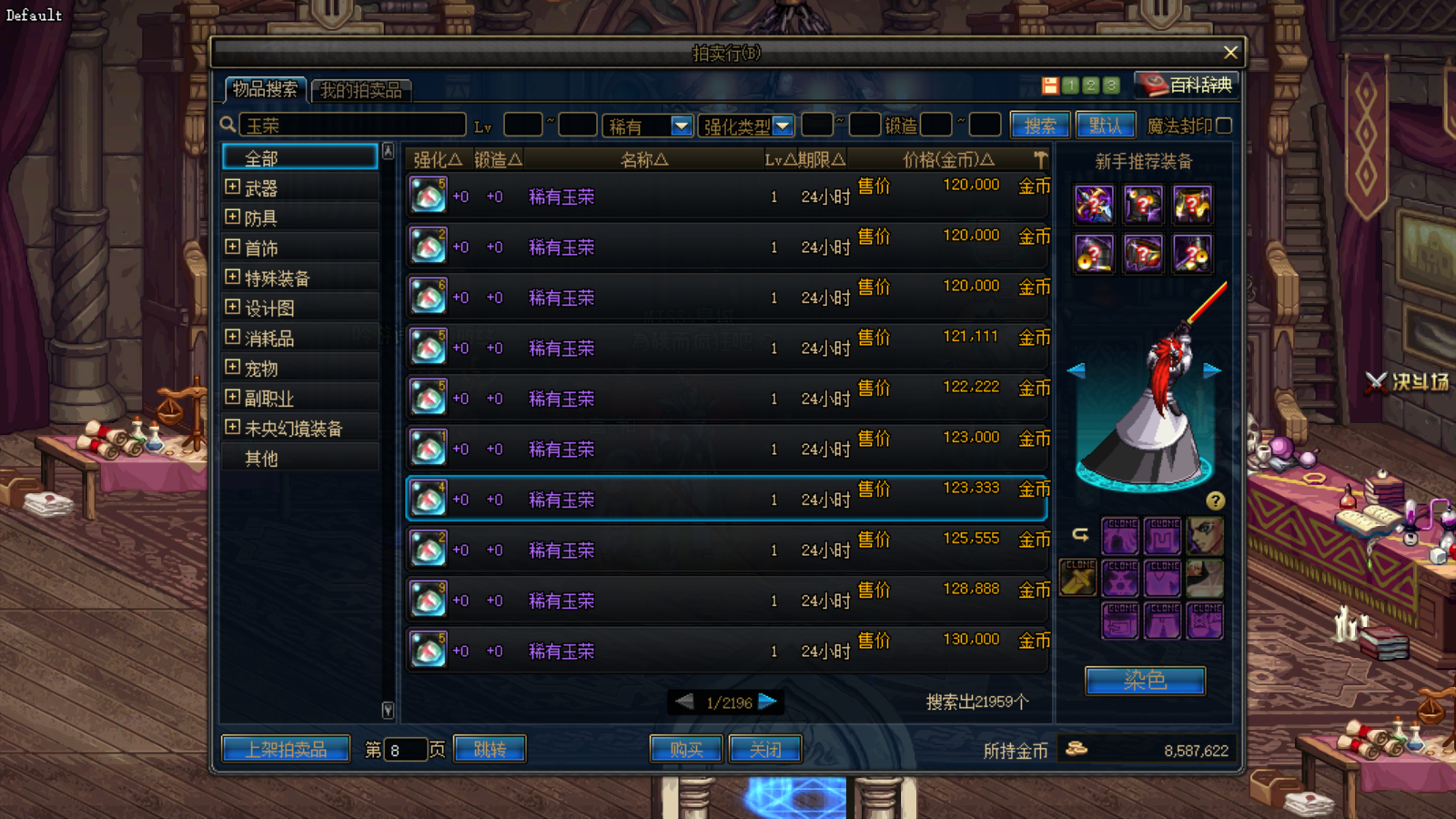 玉荣有蓝色、红色和绿色三种颜色,但是我们在拍卖行搜索只能一次性搜索稀有玉荣,但是有好几千页的玉荣,虽然也是按颜色进行了排序,但想要合适的颜色和属性也需要一个个的查看。