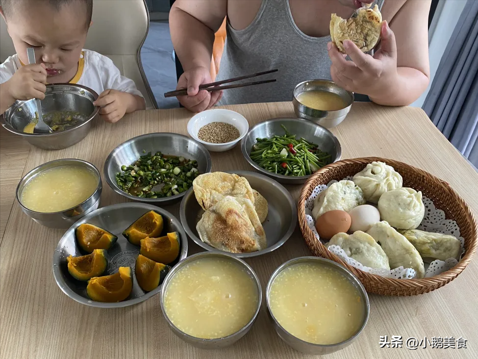 今天的早餐,虽然都是粗茶淡饭,但样子可丰盛了,有包子,有饼,有菜,有汤,有鸡蛋,还有稀饭。毕业工作十几年,没结婚没孩子时,早餐都是买着吃,说实话,从来没吃这么舒服过。