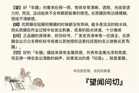 是不是有点懵?不怕,曾经网上有『老法师』说过,线下判断「车膜」好坏就要『望、闻、问、切』……