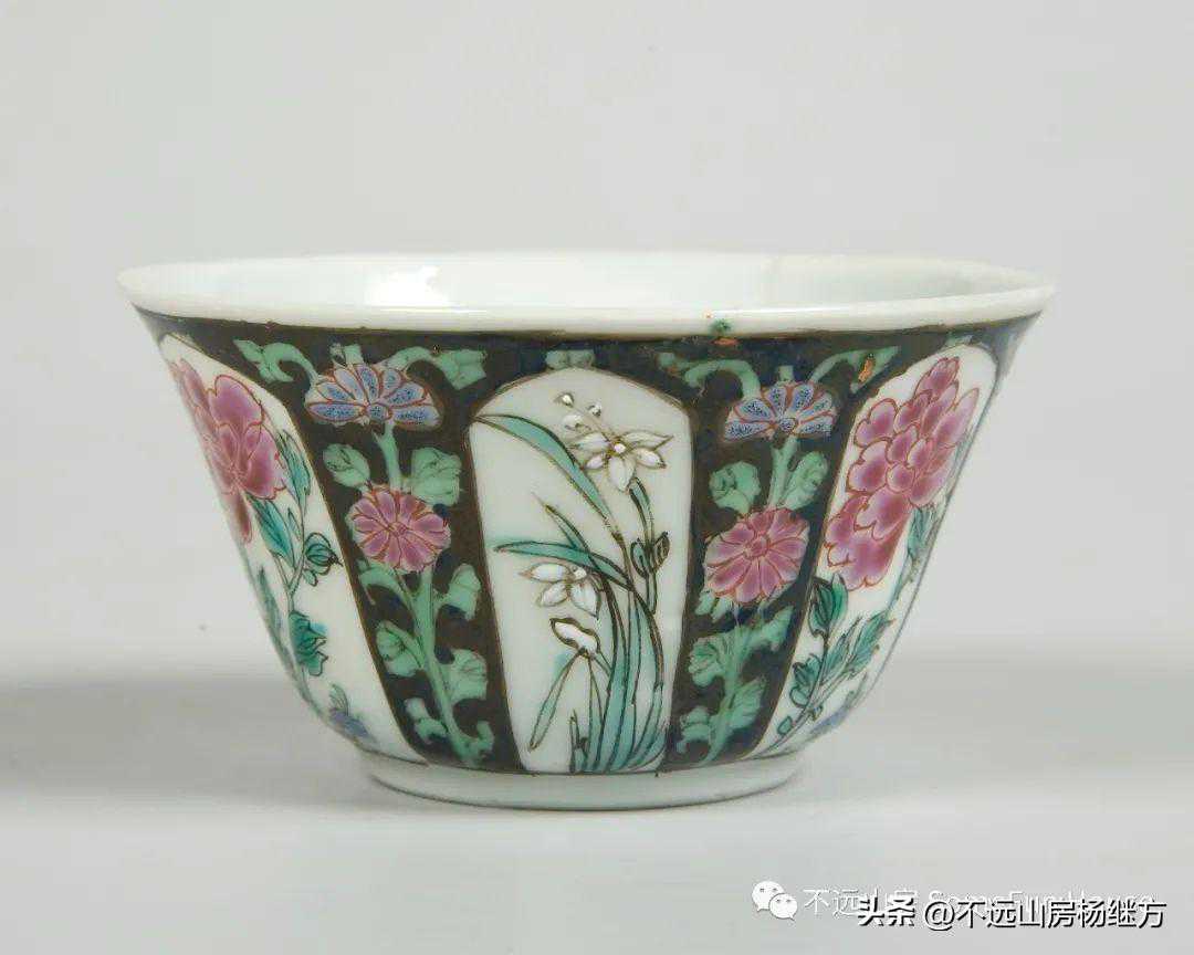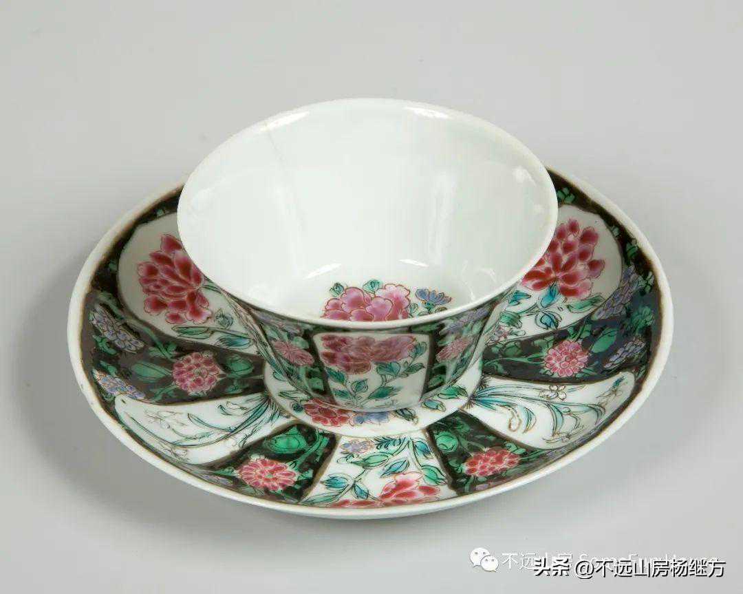 英国布里斯托博物馆藏清中期黑地开光粉彩花卉纹杯碟