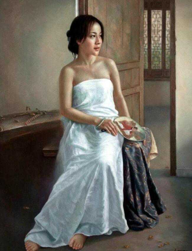 第二幅油画作品中的女子同样迷人,和第一张画中的从物风格完全不一样,只见画中的女子穿着一身白色的长裙,手里还拿着一把房子,这种风格是古代女子的穿着风格,只见画中的女子眼睛注视着正前方,这样的神情真也让我们体会到了画中女子非常的善良,我们看到女子后面窗户上的花阁同样画得非常的完美,虽然复杂也被画家李丝云完全画了出来,这样的画技相信也没多少人能做到吧?