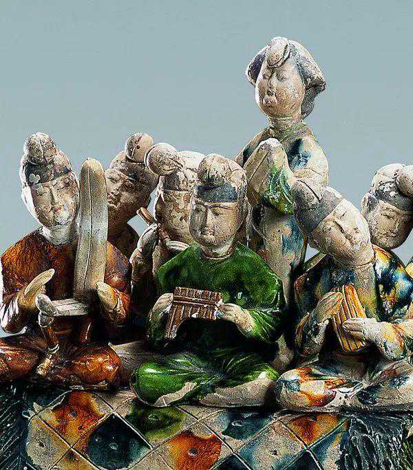 唐代三彩载乐骆驼俑,中间的女立俑梳倭堕髻