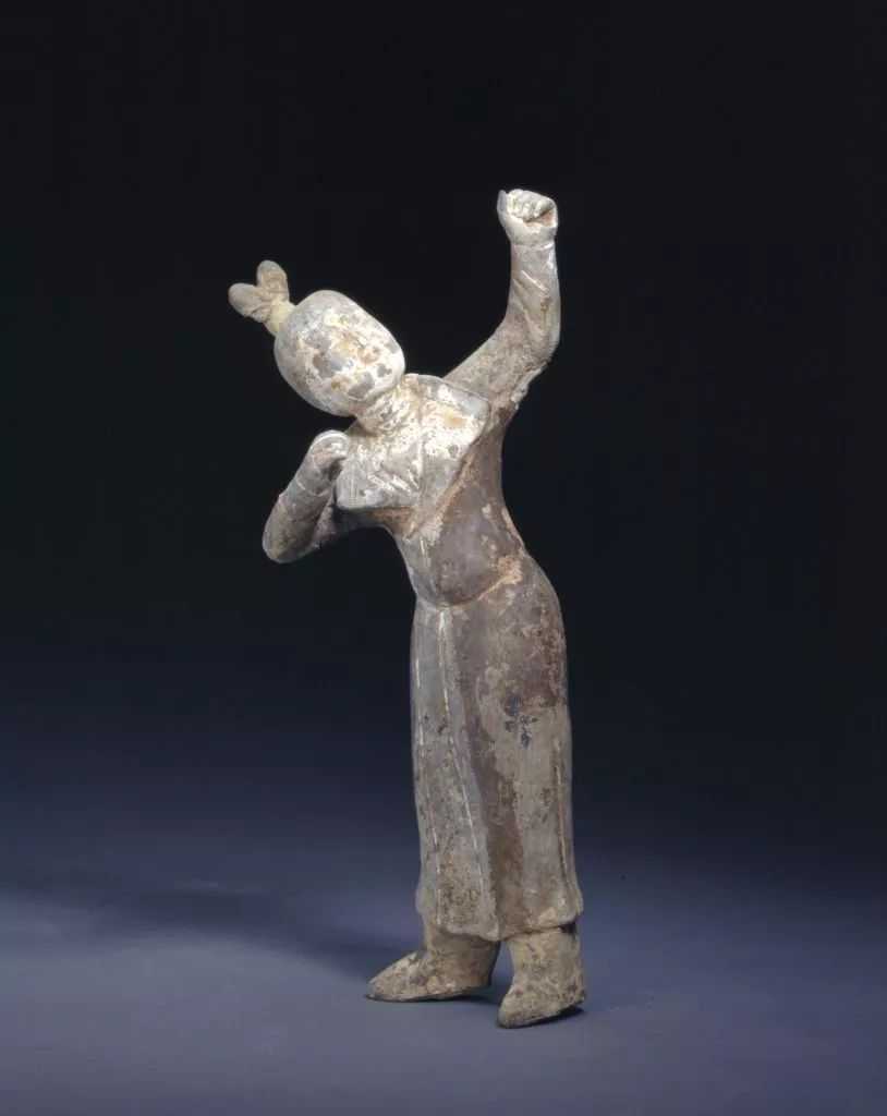 这件女俑头上略显夸张的发髻就是双环望仙髻,她身着的服装是舞女的舞裙。