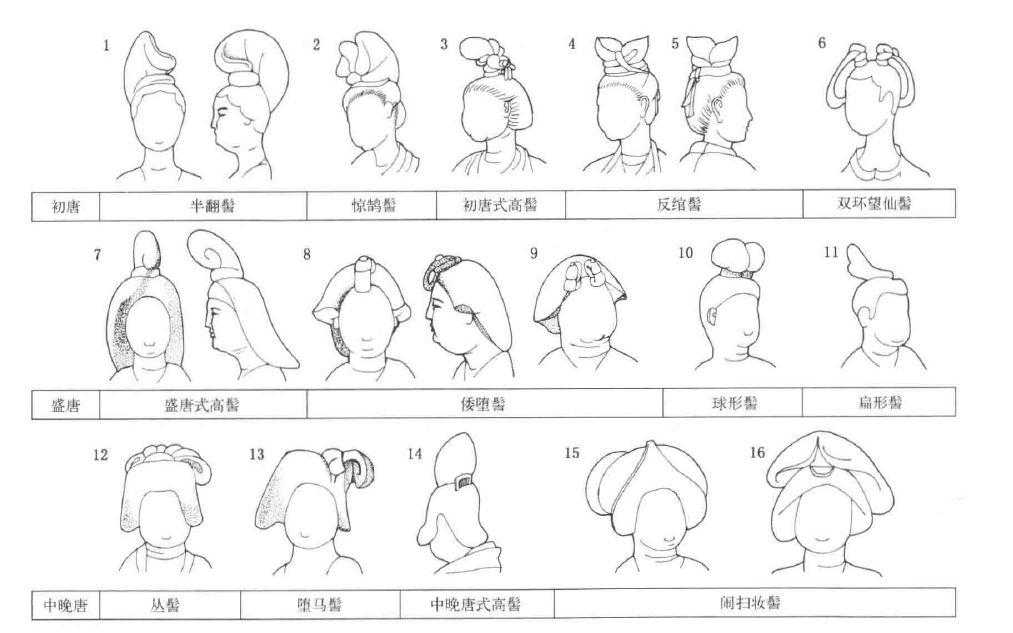 到玄宗年间,各类高髻和双鬓抱面的发髻成为主流,天宝以后以堕马髻为主,而侍女形象多见双垂髻。