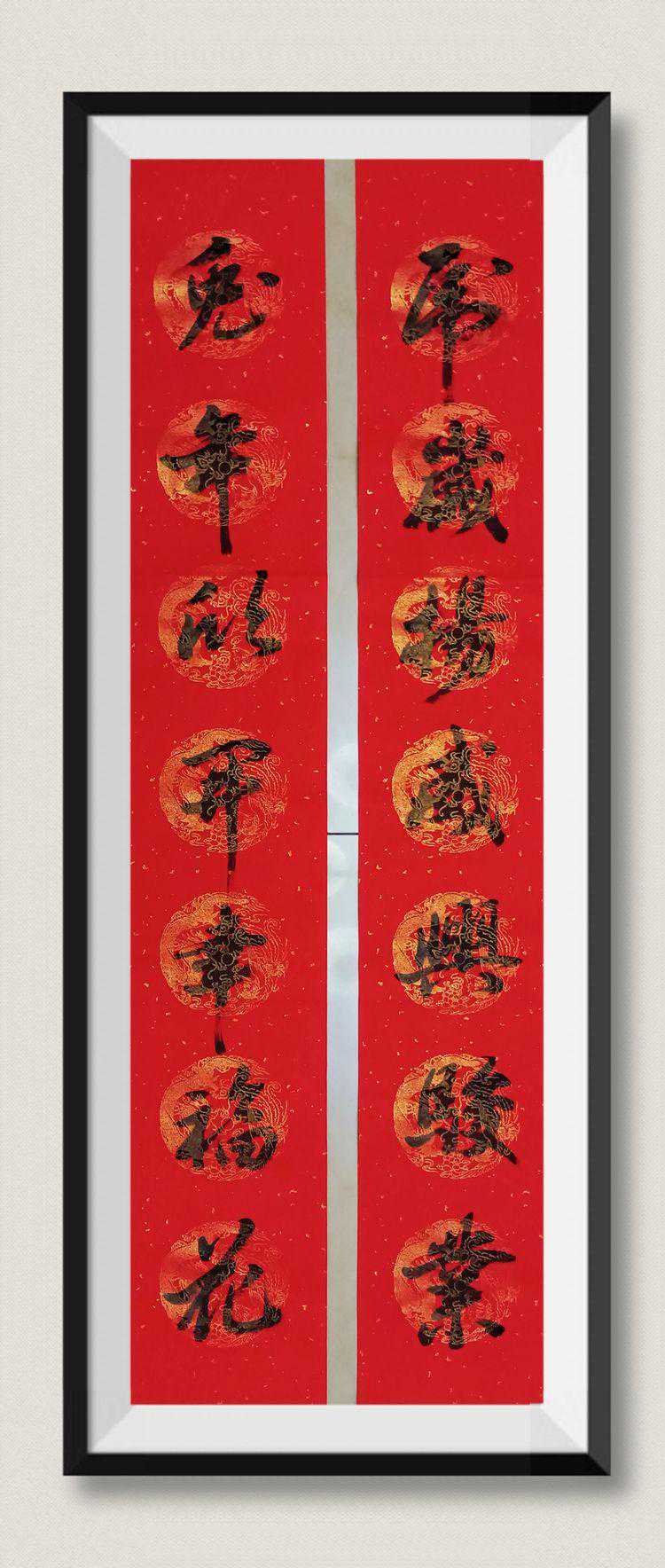 桃符更新,蟾宫降玉兔,神州臻百福。玉地祥光,天地人同寿喜贺新春,金门耀日,玉兔送福福气满乾坤。