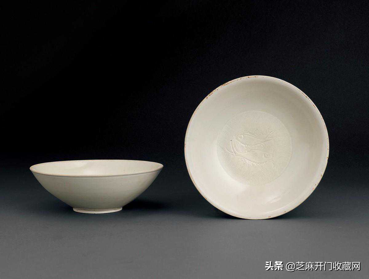 北宋定窑白瓷刻双鱼纹碗、双鱼纹盘(两件),尺寸:碗直径21.5厘米;成交价:HKD1,092,500