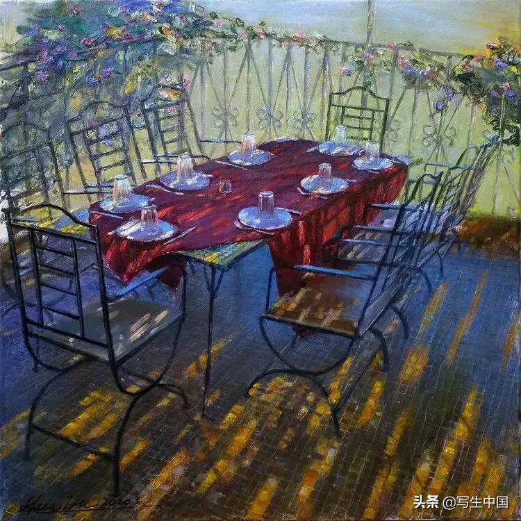 《凉棚下的餐席》油画夏瑜