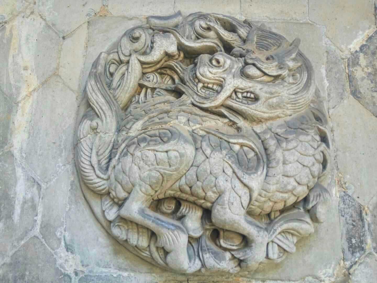 蟠龙寨现存侍郎府、东西宅、佛堂、书房院、管家院等。侍郎府是蟠龙寨最重要的建筑,一进三院,高门大户,双狮雄立,五门相照。进门迎面是巨大的麒麟凤凰砖雕照壁,四周围绕祥云海浪、珍禽瑞兽、奇花异草等吉祥图案,轻轻抹去浮尘,精雕细刻顿时栩栩如生。遗憾的是,麒麟浮雕于破四旧时被凿掉。据说,文革中为凿掉这只麒麟,村民们拿凿子、锤子轮番干了几天几夜。