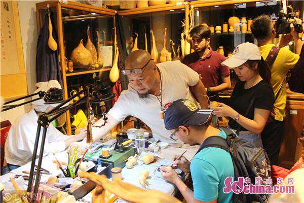 中国山东网—感知山东讯(记者李真)在中国,葫芦有代表福禄的美好寓意,葫芦生命力旺盛,又寓意多子多福,可以说葫芦是中华民族最古老的吉祥物之一,备受人们喜爱。近日,来自孟加拉国、尼日尔、老挝等国的外国友人跟随感知山东外国友人文化体验活动来到济南百花洲,跟随葫芦押花及彩刻艺术家郭文选老师和高翔老师,深入体验了中国传统葫芦艺术的魅力。