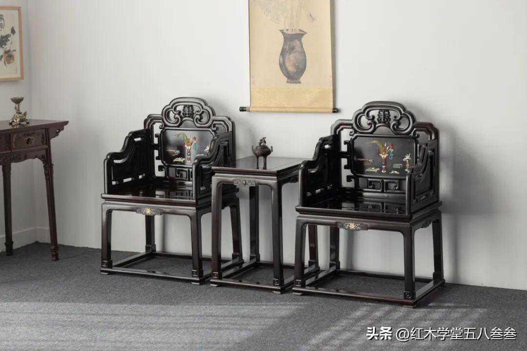 紫光檀百宝嵌琴棋书画纹清式扶手椅三件套