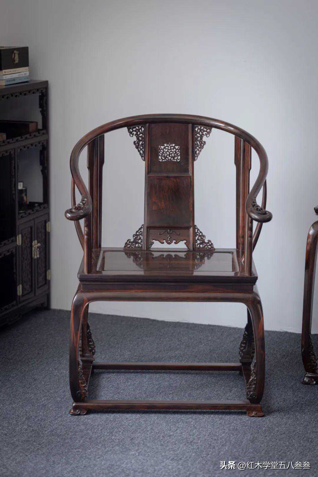 此皇宫椅是有束腰带托泥并采用了高度雕饰的圈椅。此椅靠背板为三截攒框,上截雕开光镂空花纹,是卷草纹的变体;中截镶素板,任其光素;下截亮脚,轮廓近似倒挂的蝙蝠。靠背板和椅圈及椅盘相交的地方使用了四块面积较大的镂空角牙,加强了从正面观看的装饰效果。扶手出头和四足马蹄以上,借用本来要锼剔掉的木材,镂雕卷草纹,手法比较别致。皇宫椅座面攒框嵌独板,面心板落堂踩鼓型制。皇宫椅的前后脚用料精致。此套皇宫椅用材选料精,造工细,雕饰多,但不显得过于繁琐,因其把构件都亮了出来,交代得干净利落,令人感到不是故作堆砌,皇宫椅一改明代素圈椅的质朴大方,但依然不失圈椅以舒适为主的造型主旨,骨子里透出一种高雅和闲情逸致。