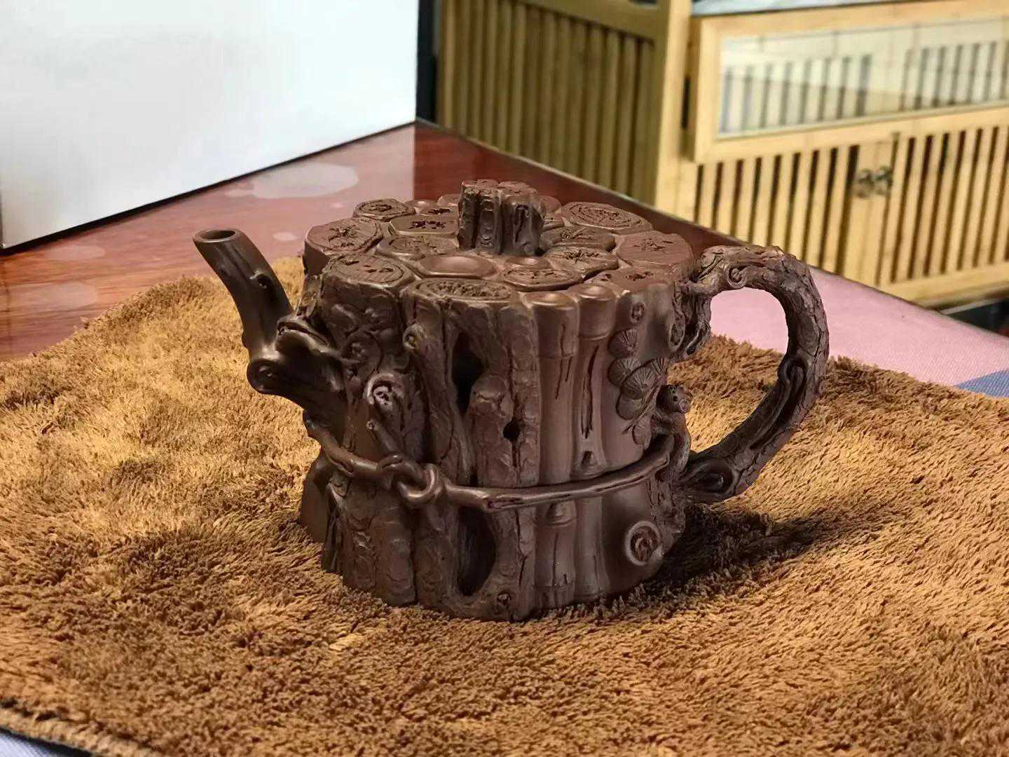 装饰使整壶浑然一体,妙不可言,全器浑若天成,壶把似虬劲的松枝,壶流如横生的梅枝,壶钮又巧似一段竹节,看似凌乱的各项元素,通过巧妙的组合和精雕细琢,束柴三友壶如何自然天成,在松段的小树洞中又雕了其它更加增添了此壶的灵动性