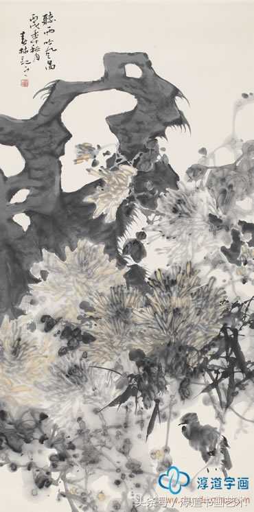 曲春林四尺竖幅花鸟画菊花《听雨吟风图》