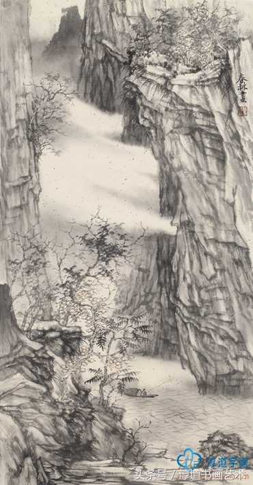 曲春林三尺竖幅写意山水画《幽谷独钓》
