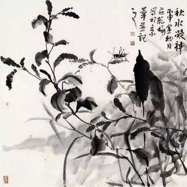 花朵基本采用没骨画法,用笔干脆,不拖泥带水,局部略有渲染,点到为止。茎、叶的用笔很有感情,用焦墨、枯笔描绘枝干,在纷乱的笔触和干湿结合的淡墨中,讲究节奏,讲究力量,将枝叶的生动姿态和在空中摇曳生长的感觉,表现的淋漓尽致。