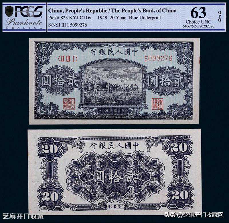 1:1949年一版币贰拾圆打场PCGSBGMS63,估价:RMB20000-30000,成交价格:RMB57500,