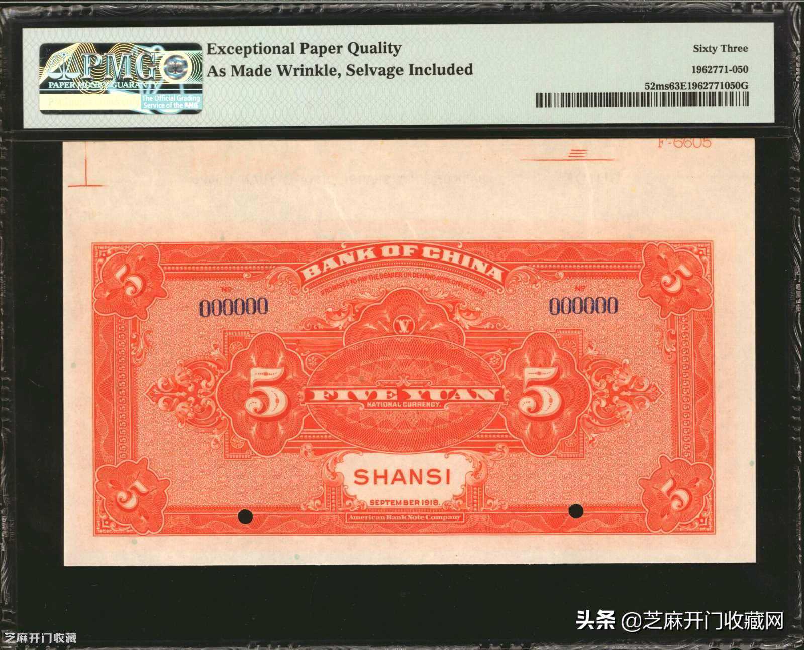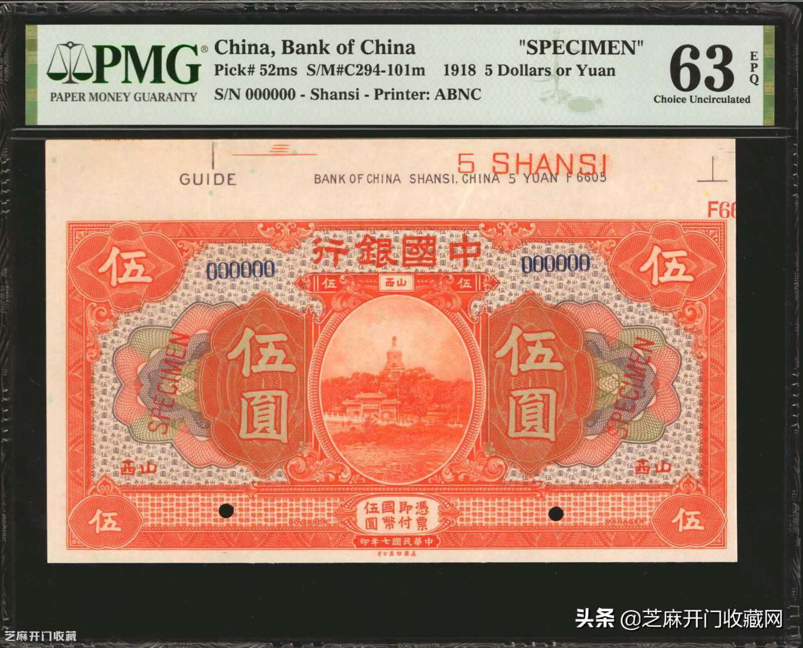 4:民国七年中国银行伍圆。样张,估价:USD1250-1750,成交价格:USD1080