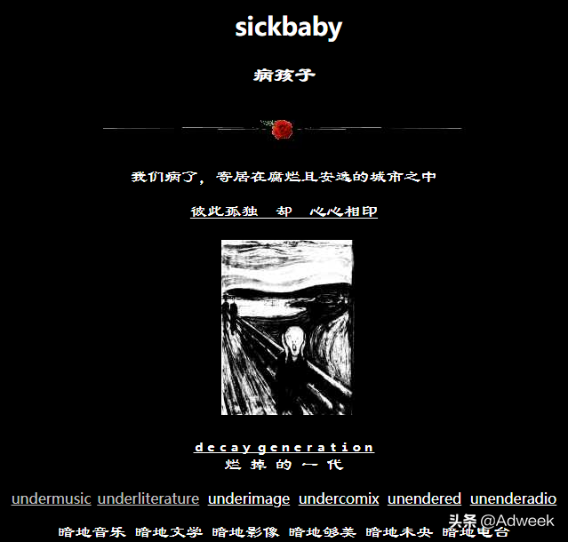 “暗地病孩子”的网页风格阴暗晦涩,黑底白字看得人眼睛发酸。该网站是那个时代文青的精神家园,安妮宝贝、小饭、张悦然、周嘉宁、苏德等青年作家都曾在这个论坛发表过文章。