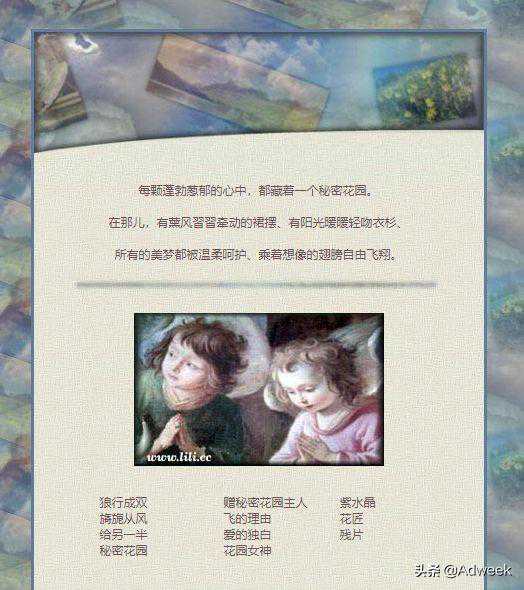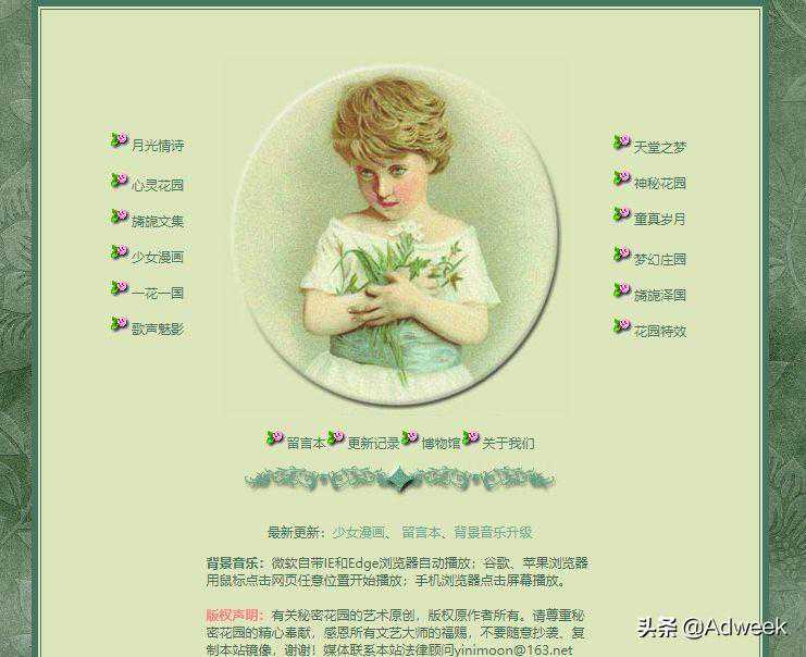 1999年1月20日,一位网名叫“旖旎”的深圳女孩建立了一个个人网站,命名为“秘密花园”。网站风格清新淡雅,放在今天来看审美依然不算过时。秘密花园里收录了旖旎自己创作的诗歌、文集,以及她喜欢的少女漫画和音乐。旖旎空灵纯净的文风与网站恬静唯美的氛围给无数网友留下了美好的青春回忆。