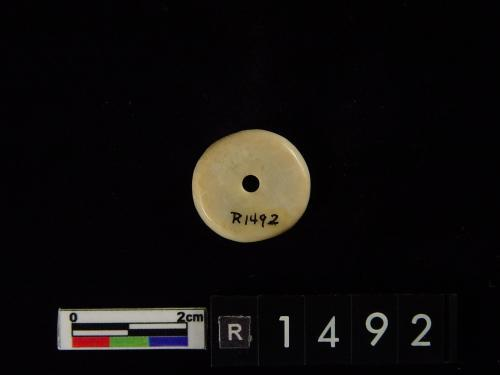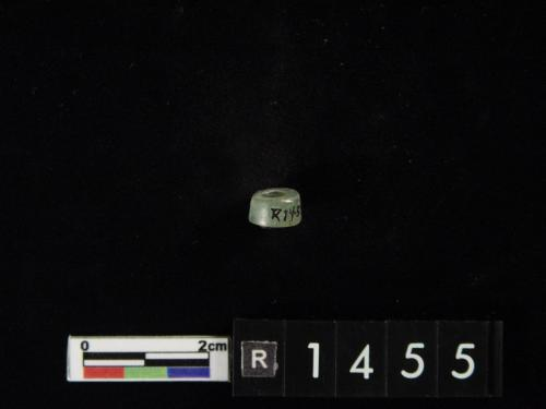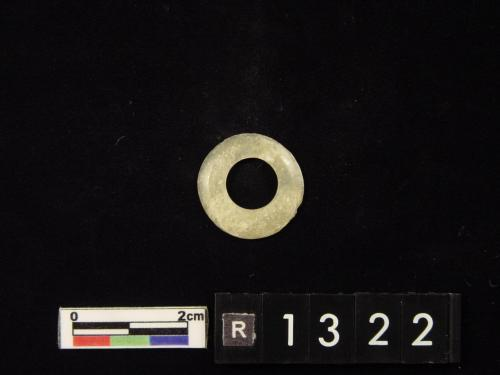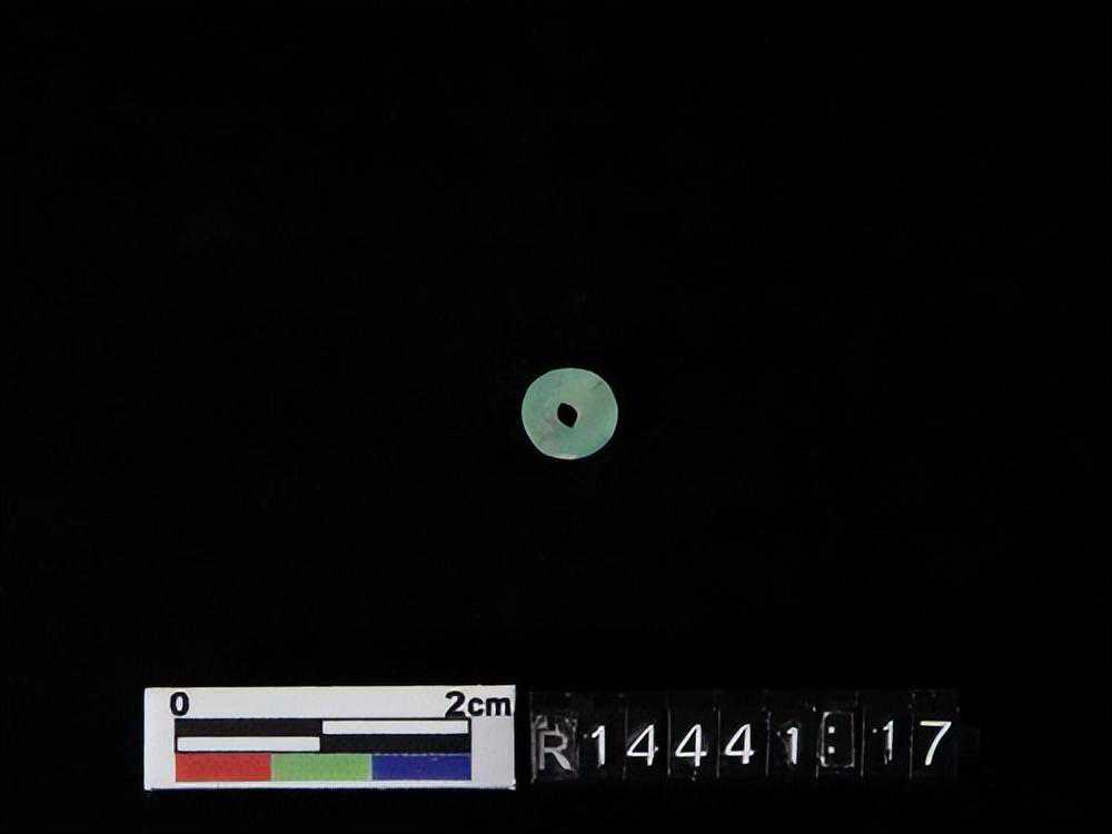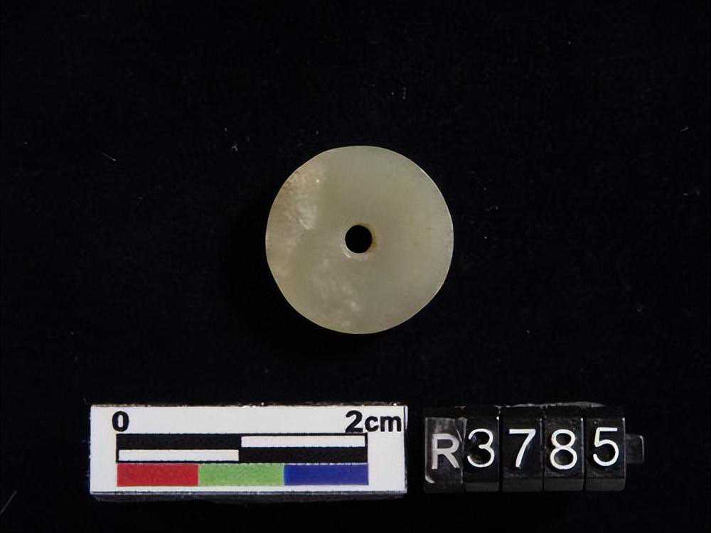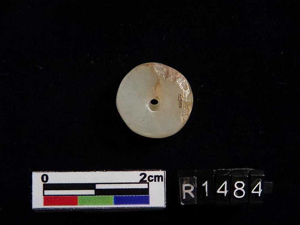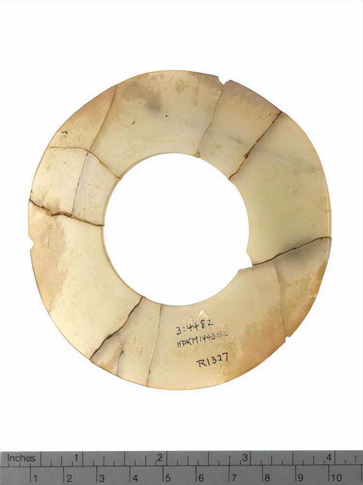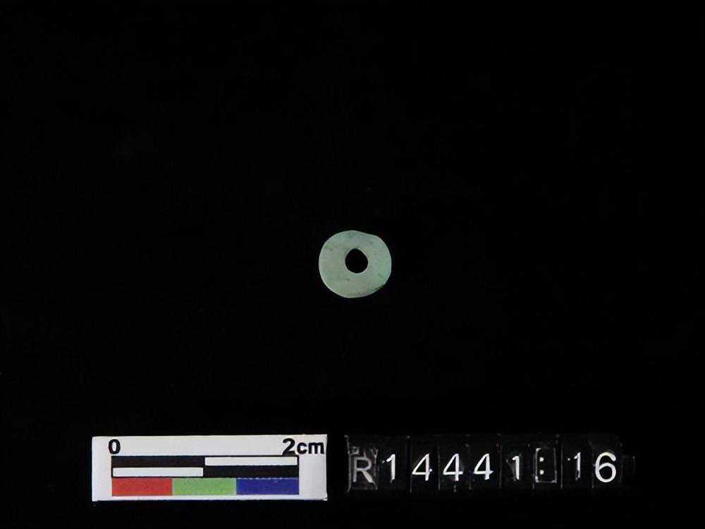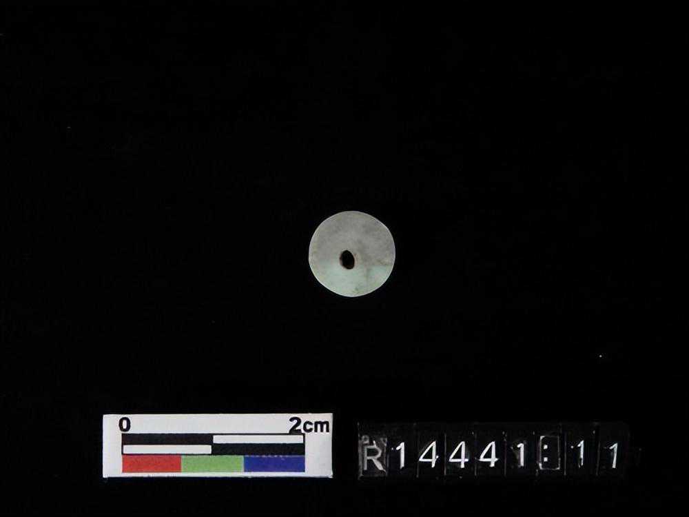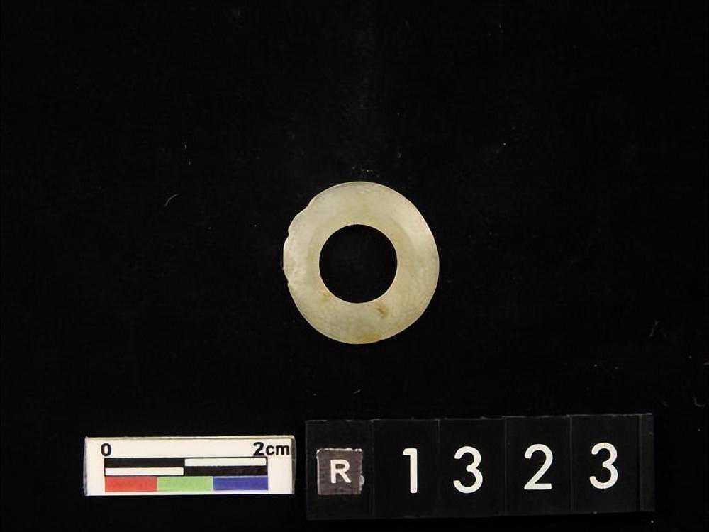 色灰白,杂绿斑,形式同1550-40墓里出的玉凸边璧(R00912)。