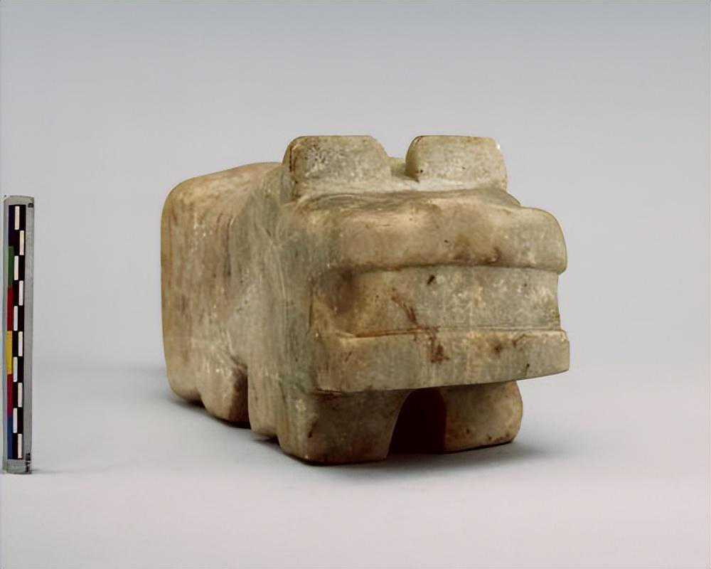 色灰白,虎形立雕,头部特大,口为一横长条,刻纹甚浅,上为弯鼻,其后为臣形眼,眼背之间耸立两耳,中有一缺口,背部凹下不平,腹下为一长形足,亦不平整,腹后部为一长尾。尾尖略翘起。