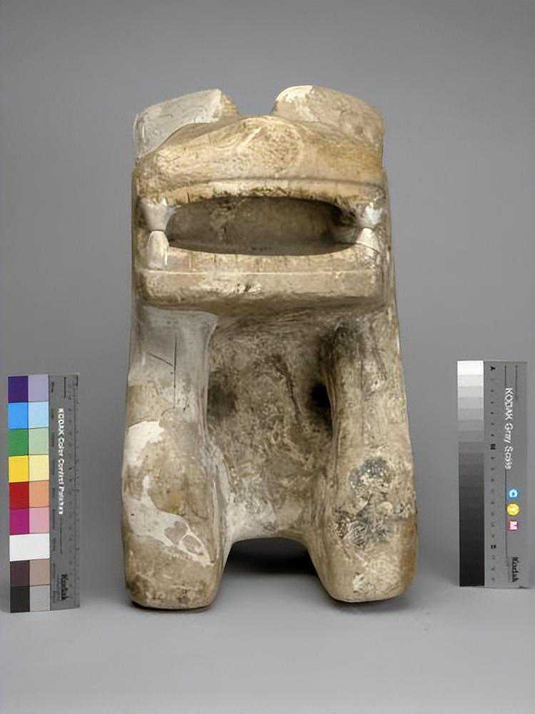 立体雕刻,曲膝跪坐,臀压后爪上,前爪正置膝上,有五趾,头自肩直出,无项,向前突出身外,口大张凹入甚深,齿牙如锯,最左与最右之对牙均残断,鼻在口上,有两小孔,两眼如臣形,居左右,其后有两耳,竖立如扇,右耳已残缺,胸腹凹入,后背由耳下直达底部,有槽一道,通体雕饰花纹,色灰白杂黄,表面风化,剥蚀不光滑,有黑斑。