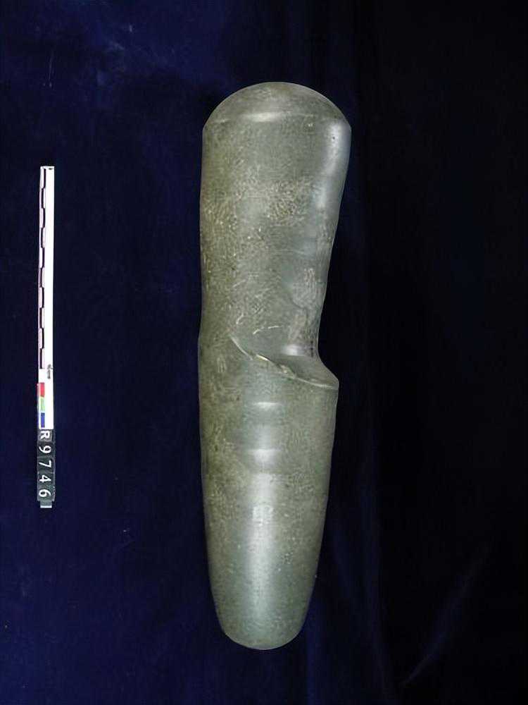 深灰色,带有棕色斑痕,全部磨制,部份沾有棕色土。顶端中拱,似一半圆形,由顶端下渐窄,至中腰又突起似一肩状。下段亦为圆柱,上有绳纹,末端亦为半圆球状。